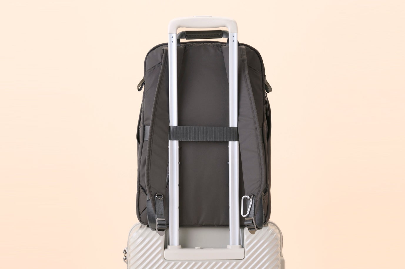 スーツケースのプルドライブハンドルにリュックを固定できる「セットアップベルト」。