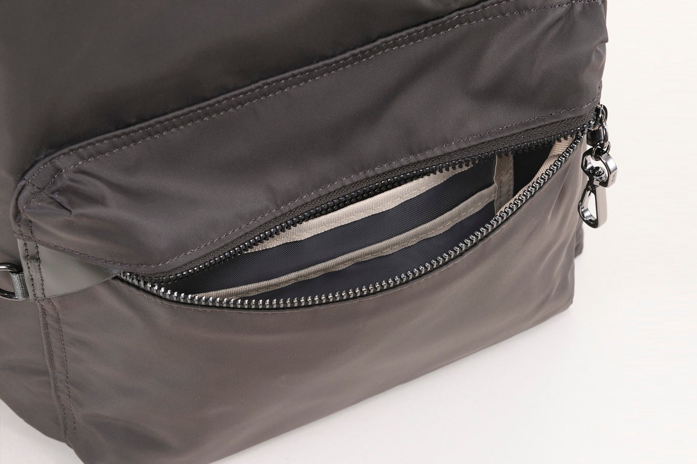 小物収納に便利な「フロントポケット」がひとまわり大きくなり、さらに内装ポケットが増えました。