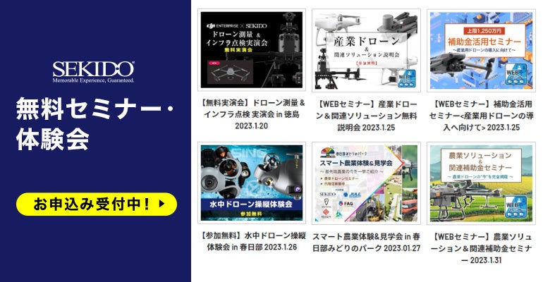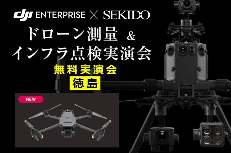 日本初のDJI正規販売代理店である株式会社セキド(本社:東京都港区、代表取締役:⼤下貴之)ではセキド 徳島中央と共同で、2023年1月20日(金)14時より徳島県美馬市にて、最新の小型産業用ドローン「DJI MAVIC 3 ENTERPRISE(ディージェイアイ マビック 3 エンタープライズ)」や、DJIの産業用フラッグシップ・ドローン「MATRICE 300 RTK(マトリス 300 アールティーケー、以下 M300 RTK)」と対応カメラモジュール「Zenmuse(ゼンミューズ) L1/P1/H20T/H20N」、小型産業用ドローン「DJI MATRICE 30 T(ディージェイアイ マトリス 30 ティー)」の性能が確認できる、構造物点検と測量の無料実演会を開催いたします。ドローン及び対応カメラの性能を、測量・点検を模したデモフライトでご確認いただき、撮影データをお持ち帰りいただける、導入検討中の事業者に最適なイベントです。補助金・助成金を活用した導入を検討されているお客様も、ぜひこの機会にご参加ください。