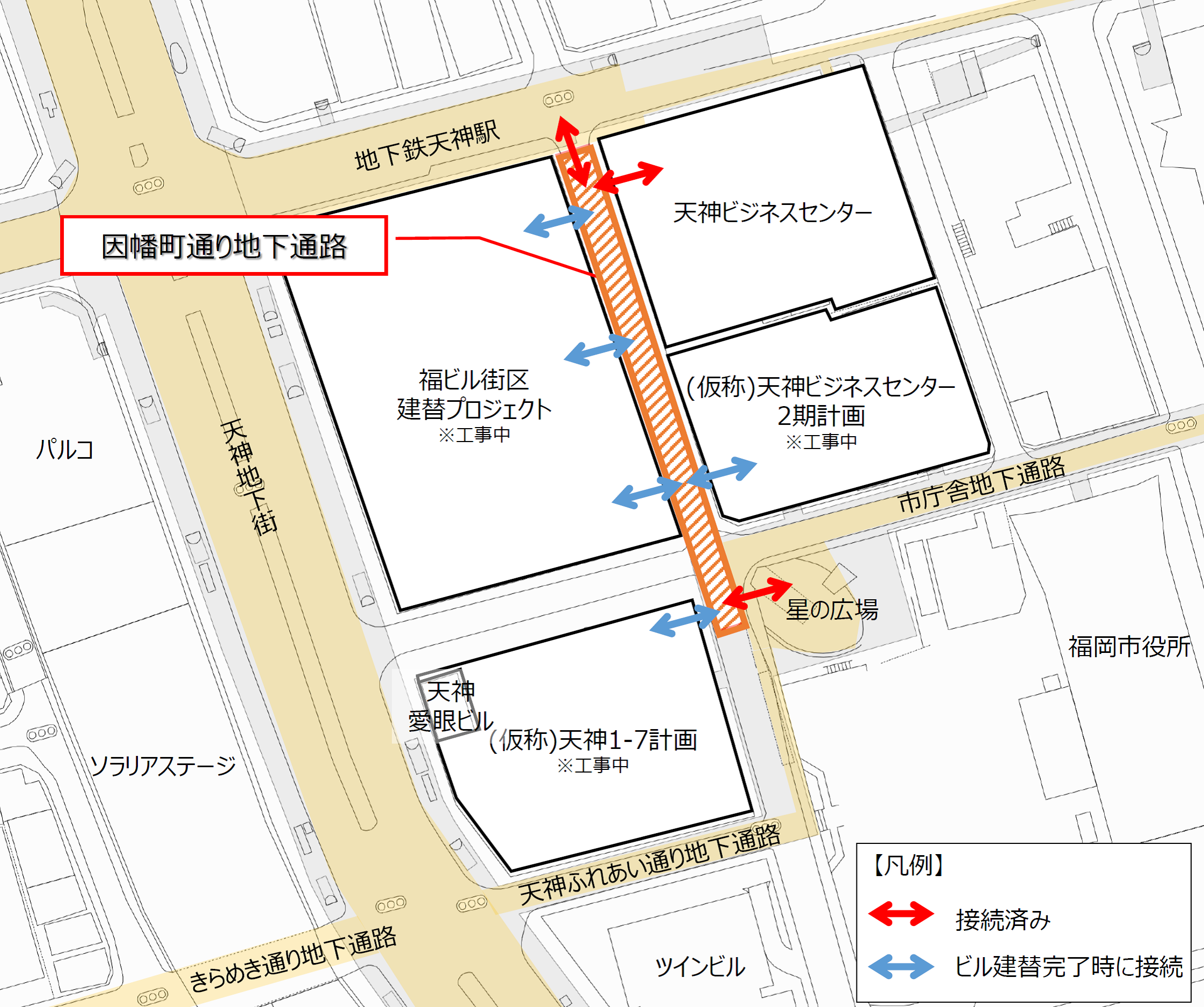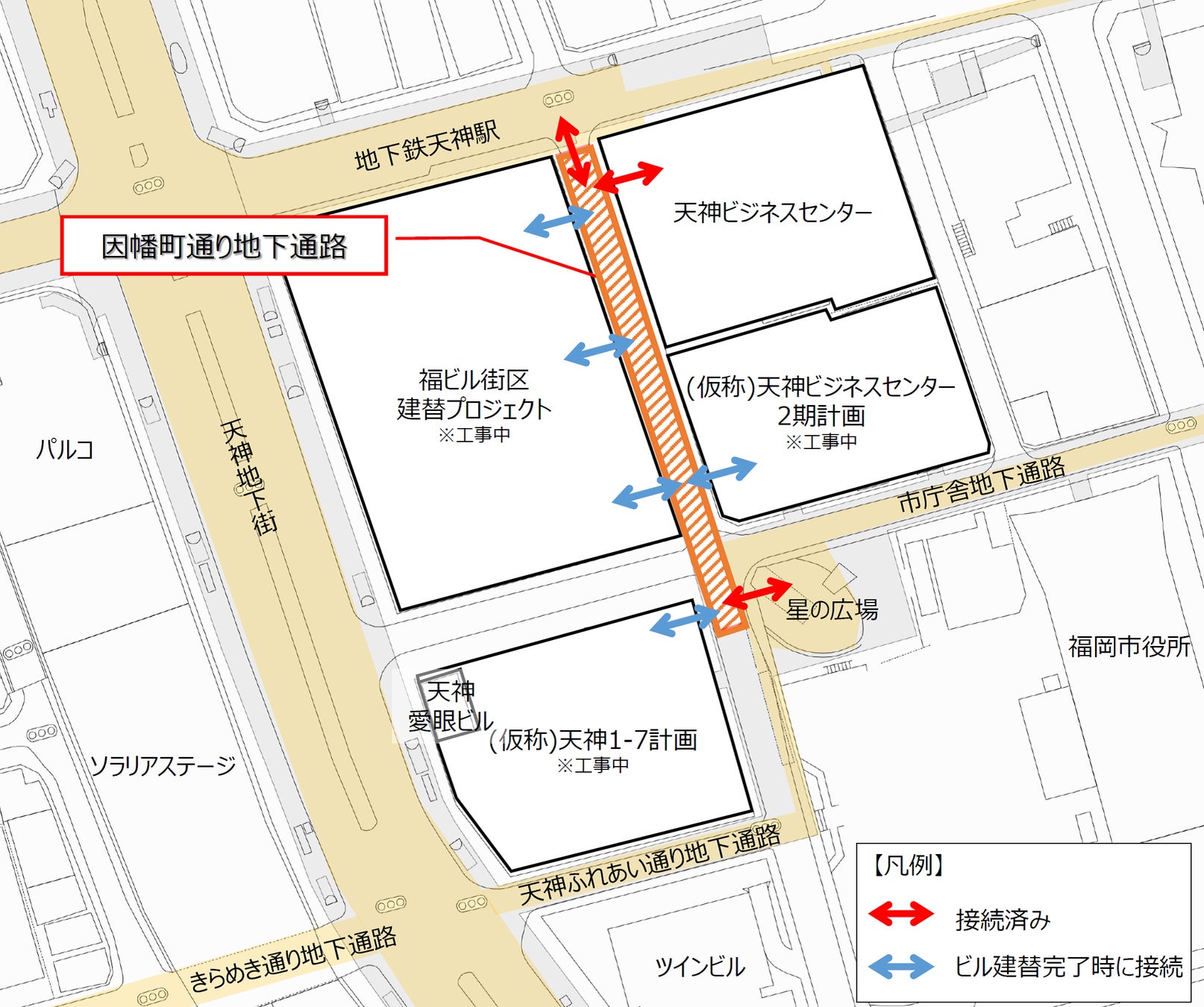 本地下通路は、天神一丁目交差点と福岡市役所西交差点を結ぶ因幡町通りの地下に整備した約140mの通路です。「地下鉄天神駅コンコース」と、福岡市役所や既存の地下通路へつながる「星の広場」をバリアフリーで接続することで、地下ネットワークの強化に寄与しております。また、隣接する天神ビジネスセンターとの接続に加え、2025年春の「福ビル街区建替プロジェクト」完了時には新たに3ヶ所で接続し、回遊性の向上や賑わいの創出を図ります。