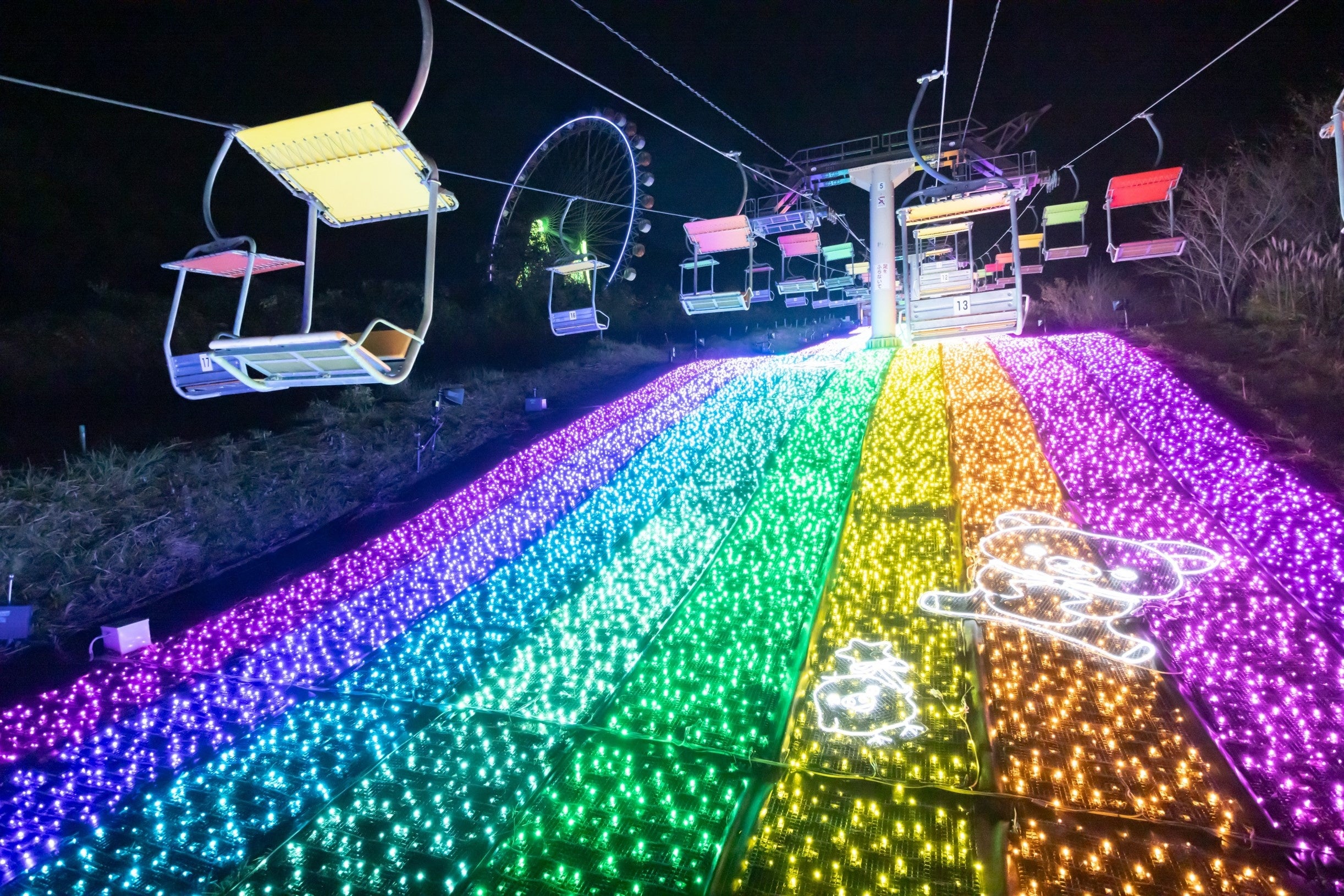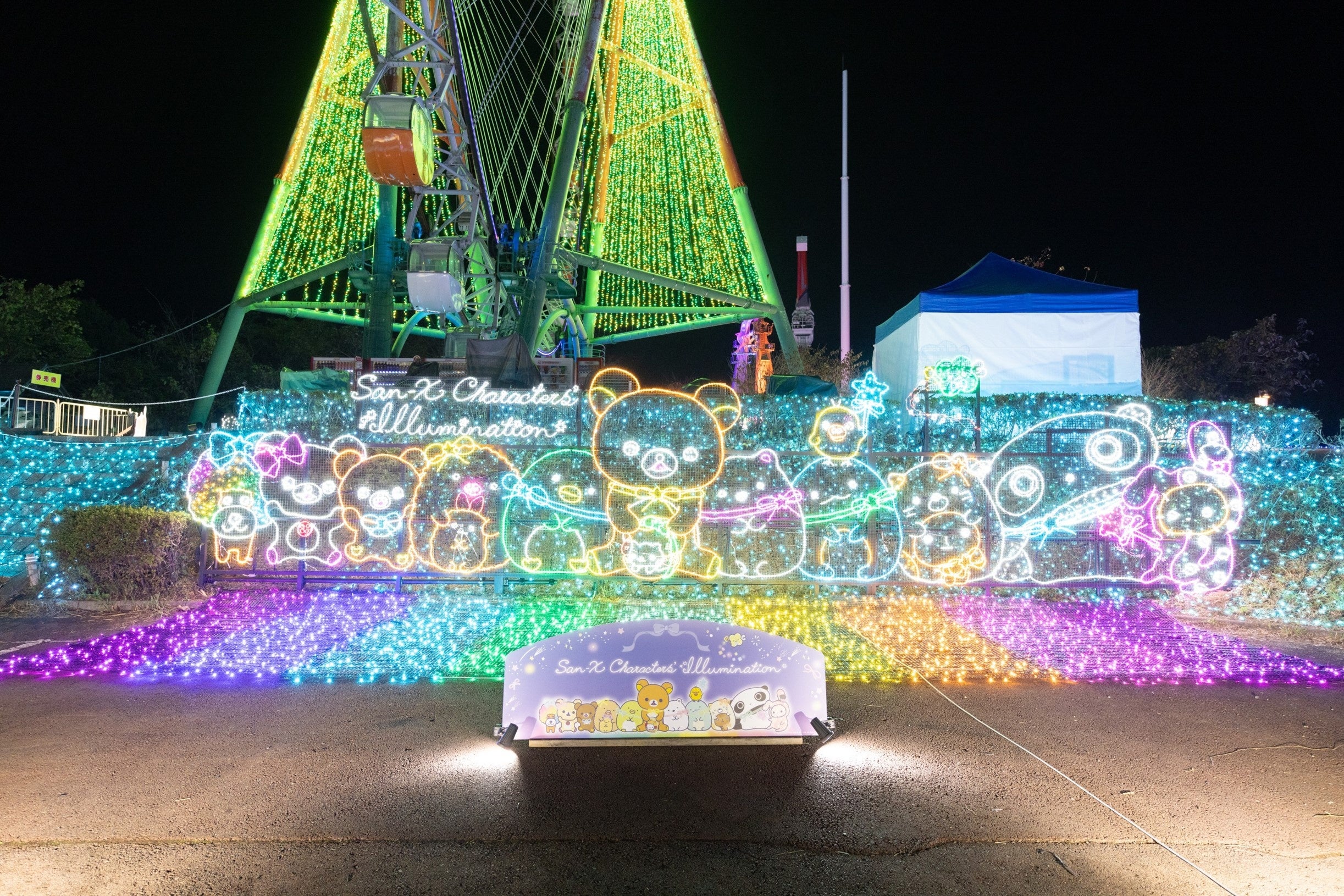 全長250m、虹色に輝く虹のリフトに乗り、降りたった山頂が「サンエックスキャラクターズイルミネーション」エリアです。「リラックマ」「すみっコぐらし」「たれぱんだ」「アフロ犬」「こげぱん」「にゃんにゃんにゃんこ」「センチメンタルサーカス」の7キャラクターをテーマにしたイルミネーションスポットのほか、「えびえびEveryday!!」や「ベリーぎゅっとコリラックマ」などの楽曲を使用し、アフロ犬も登場するスペシャルイルミネーションショーもお楽しみ頂ける、夢あふれる空間です。