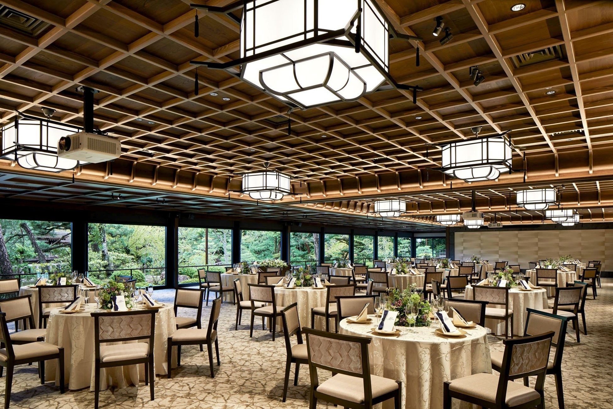 京都の三大祭りの一つである「時代祭」が執り行われる平安神宮は、1895年(明治28年)に建立された京都随一の神宮。多くの重要文化財、登録有形文化財を持ち、境内にある平安神宮神苑は国指定名勝。「平安神宮会館」は神苑を借景に、平安神宮御鎮座70年並孝明天皇100年祭を記念して境内に建てられました。ラウンジではアフタヌーンティーが楽しめ、2つのバンケットスペースではパーティや披露宴を承っています。