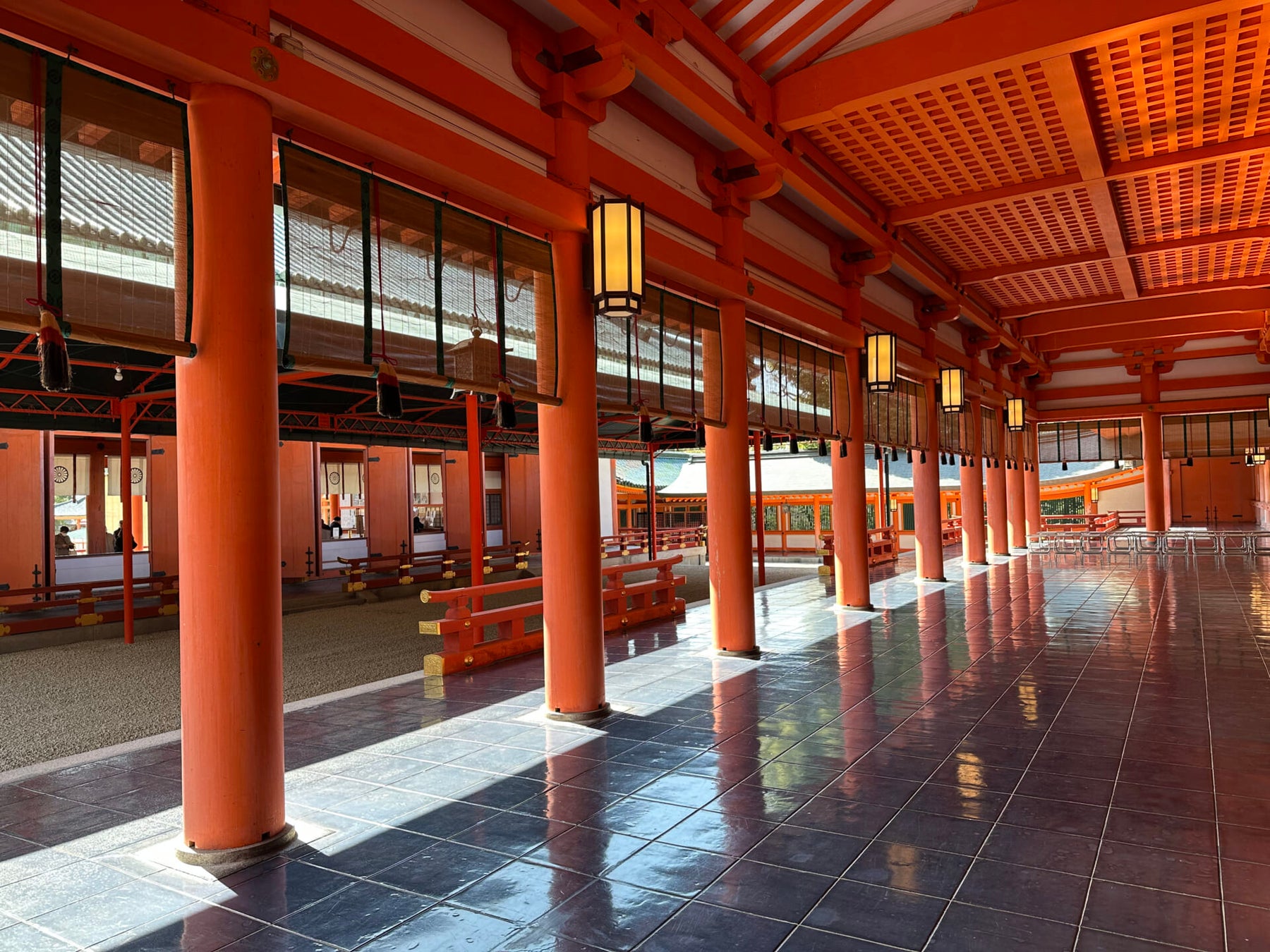 朱色の社殿が美しい厳かな空間の中で、笛、笙、篳篥(ひちりき)など1200年以上の歴史を持つ日本の古典音楽の音色に心癒すひとときをお過ごしください