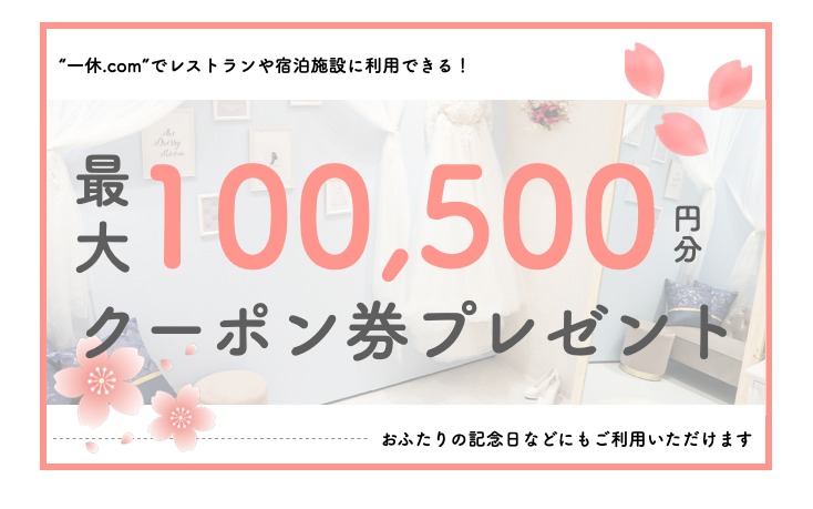 PLACOLE & DRESSYSNS総フォロワー数90万人突破記念として、最大100,500円分に増額しプレミアムクーポンをプレゼントいたします。レストランやホテルの宿泊でご利用いただけるクーポンはこれからの結婚式準備の束の間のひとときに癒しとステキな時間を過ごしていただきたいと思い、ご用意いたしました。おふたりの記念日などにもご利用いただけます。DRESSY ROOM来店後、プラコレウェディングの認定会場1700以上の全国の結婚式場のブライダルフェアの予約・成約をするともらえる最大100,500円のクーポン。賢くオトクに結婚式場探しをしせんか?