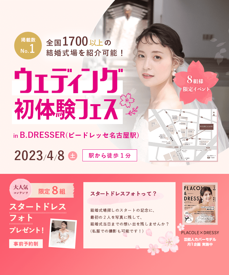 PLACOLE&DRESSY(プラコレ&ドレシー)の“体験型”花嫁相談カウンター【DRESSY ROOM】で開催中の『ウェディング初体験フェス』の名古屋開催が決定。名古屋駅徒歩1分の「B.DRESSER(ビードレッセ)」で安心のアクセスということもあり、お立ち寄りいただきやすい場所となっております。