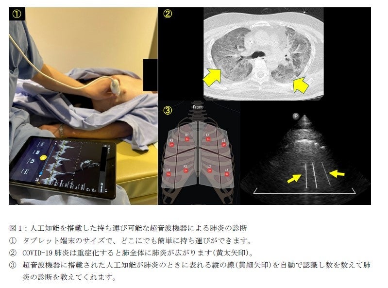 近年、持ち運び可能な小型超音波機器の発展に伴い、人工知能が超音波検査の画像を解読し、専門医師でなくても肺炎を診断することができる可能性がでてきました(図1)。そこで、研究グループは、人工知能を搭載した持ち運び可能な超音波機器を使用することにより、専門医師でなくてもCOVID-19肺炎を正しく診断することが可能になると考え、その有効性を検証しました。