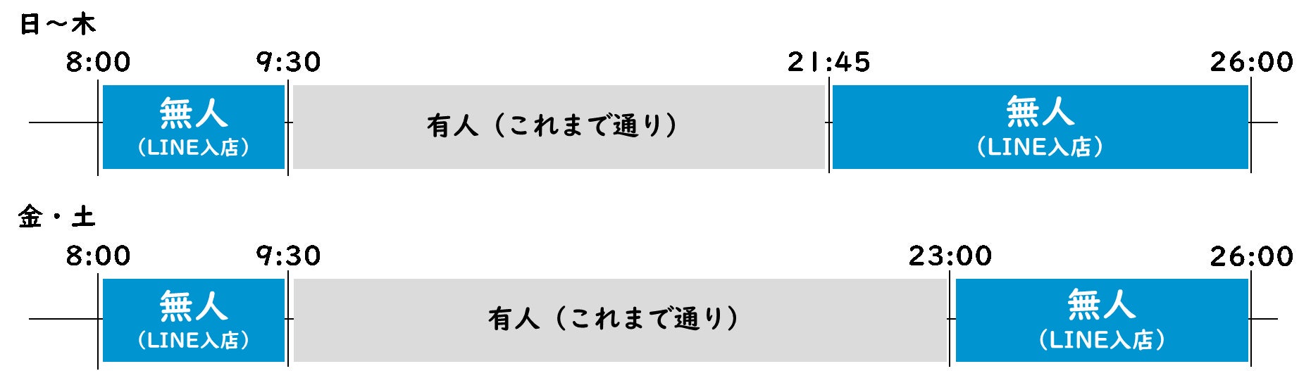 ※無人営業時間は、キャッシュレス決済のみ(クレジットカード・電子マネー・二次元バーコード決済のみ、現金不可)