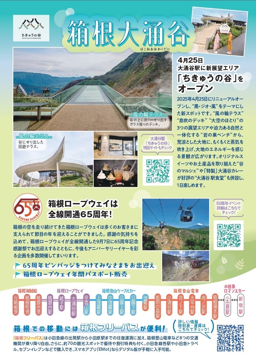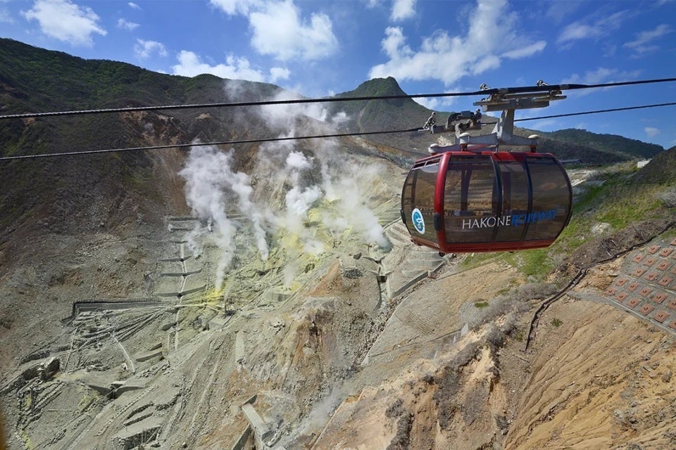 2025 年 9 月 7 日に全線開通 65 周年を迎える箱根ロープウェイは、早雲山~桃源台間の全長約 4kmを結び、早雲山から大涌谷間では、約 130m下の大涌谷谷底の景色が楽しめ、桃源台方面へ向かう途中には富士山や芦ノ湖の景色を望むことができます。1959 年 12 月に早雲山〜大涌谷間、翌年 1960 年 9 月 7 日に大涌谷〜桃源台間が開業し、「箱根ゴールデンコース」が完成、多くの観光客に親しまれてきました。