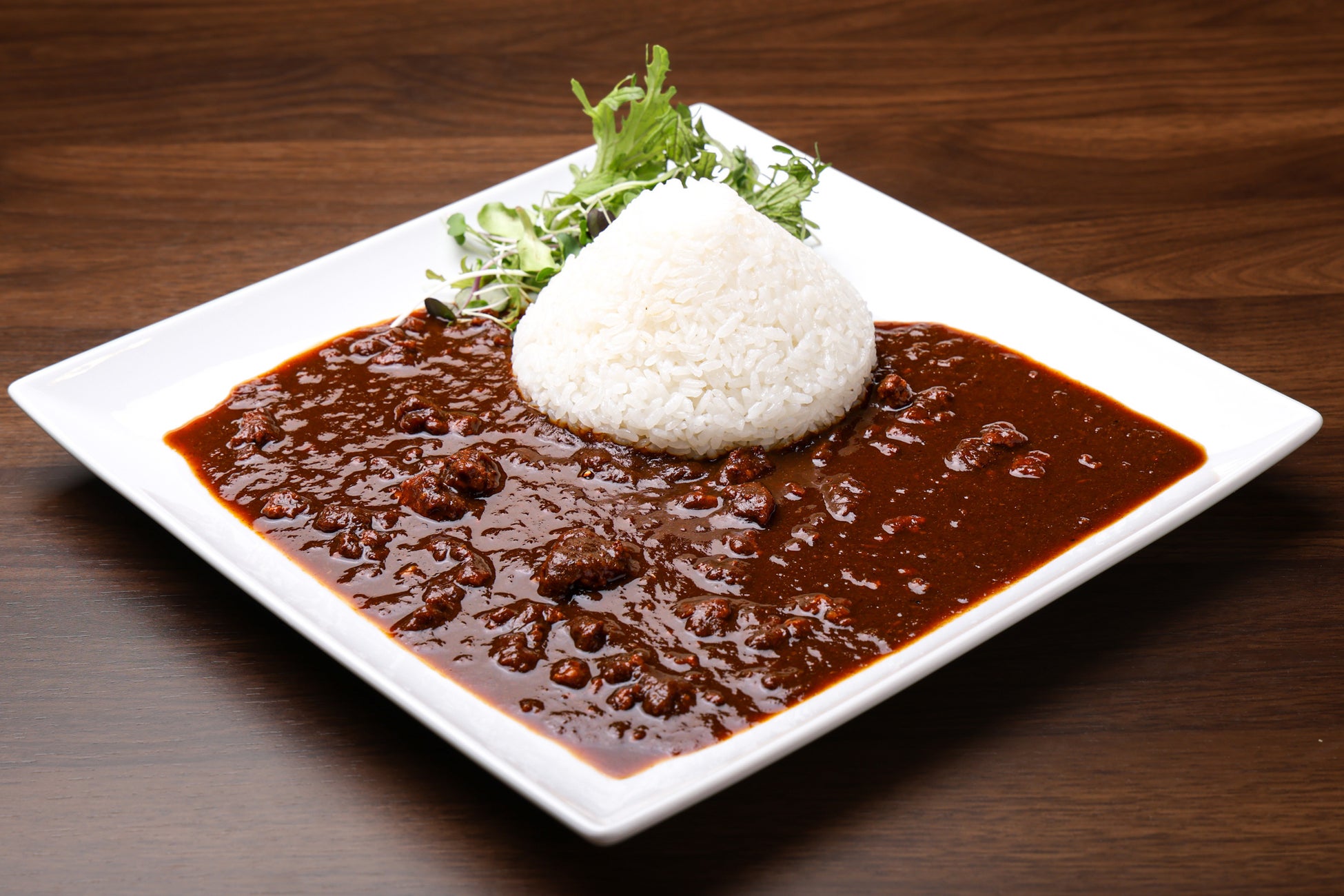 厳選したスパイスをブレンドした旨味たっぷりのポークカレーです。ごはんを富士山型に盛り、黒褐色のソースで富士山の裾野をイメージしました。ごはんは300gもあるので、食べ応えのある一皿です。4種類から好みのトッピングを選んで味変も楽しめます。