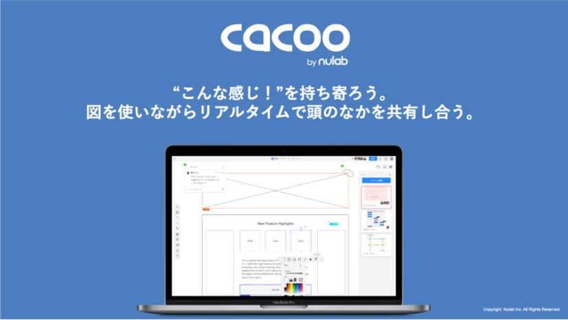 オンライン作図ツールの「Cacoo」は、プロジェクトのアイデアやウェブサイトのレイアウト、作業計画などをオンライン上で簡単に作成し、チーム内に共有できる Web サービスです。ワイヤーフレーム、フローチャート、組織図、マインドマップ、オフィスレイアウトまで、豊富なテンプレートや図形を元にあらゆる図が作成・共有できます。2009年のベータ版リリース以降、世界中のさまざまな業種・チームで利用されています。