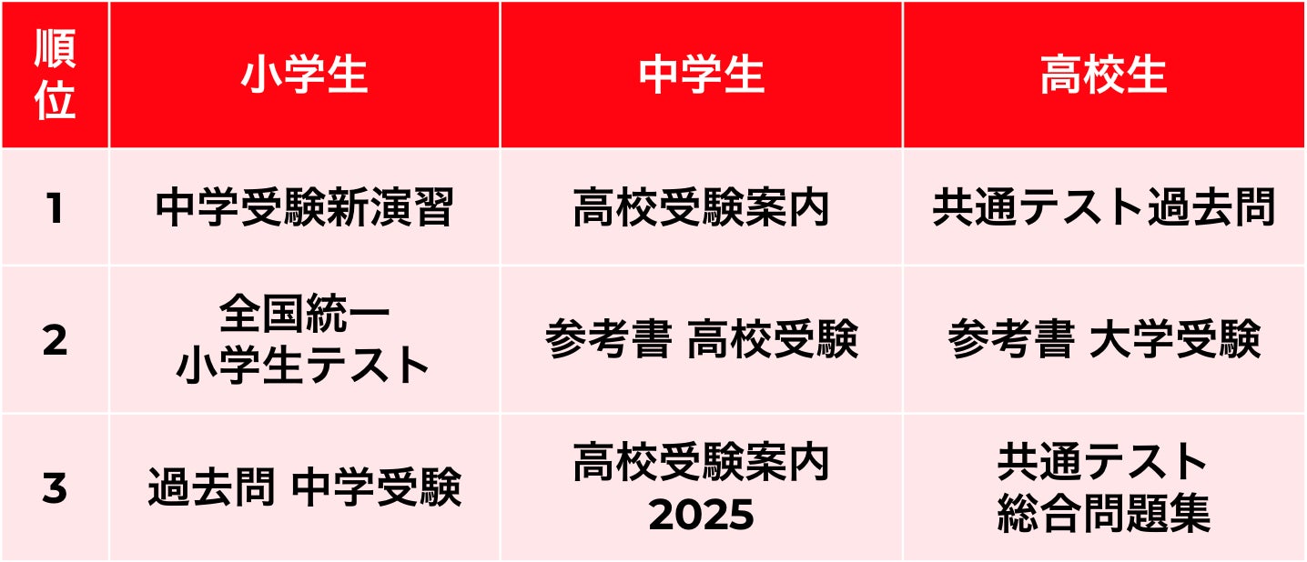 ●卒業・新年度の時期に検索が増える参考書・過去問、小中高別検索ワードランキングTOP3