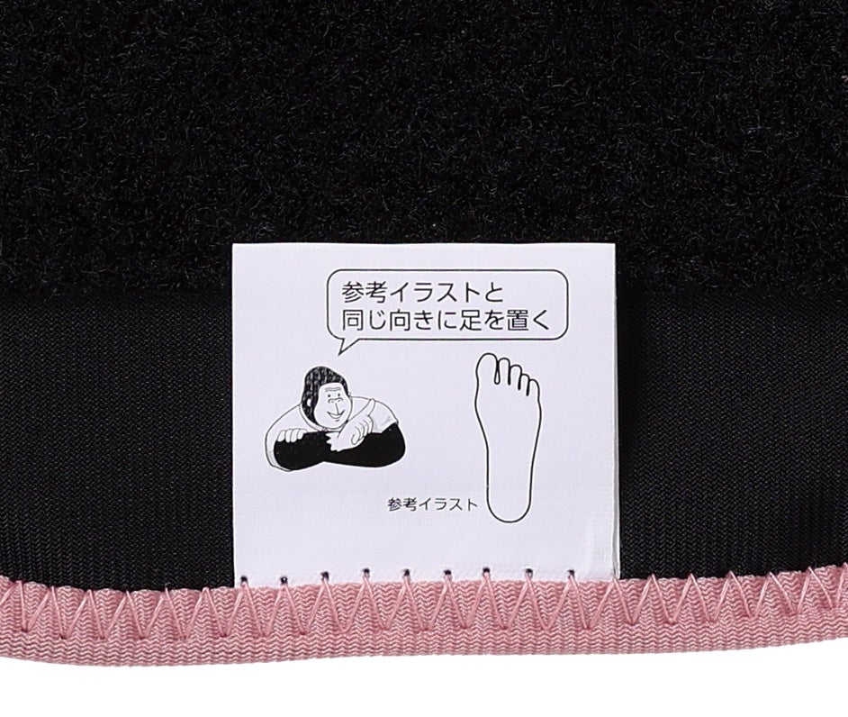 手軽にどなたでも使っていただけるように、面ファスナー仕様となっています。足に巻くだけで簡単に装着ができます。また、内側の取付位置の目安タグには、ゴリラのイラストが描かれています。
