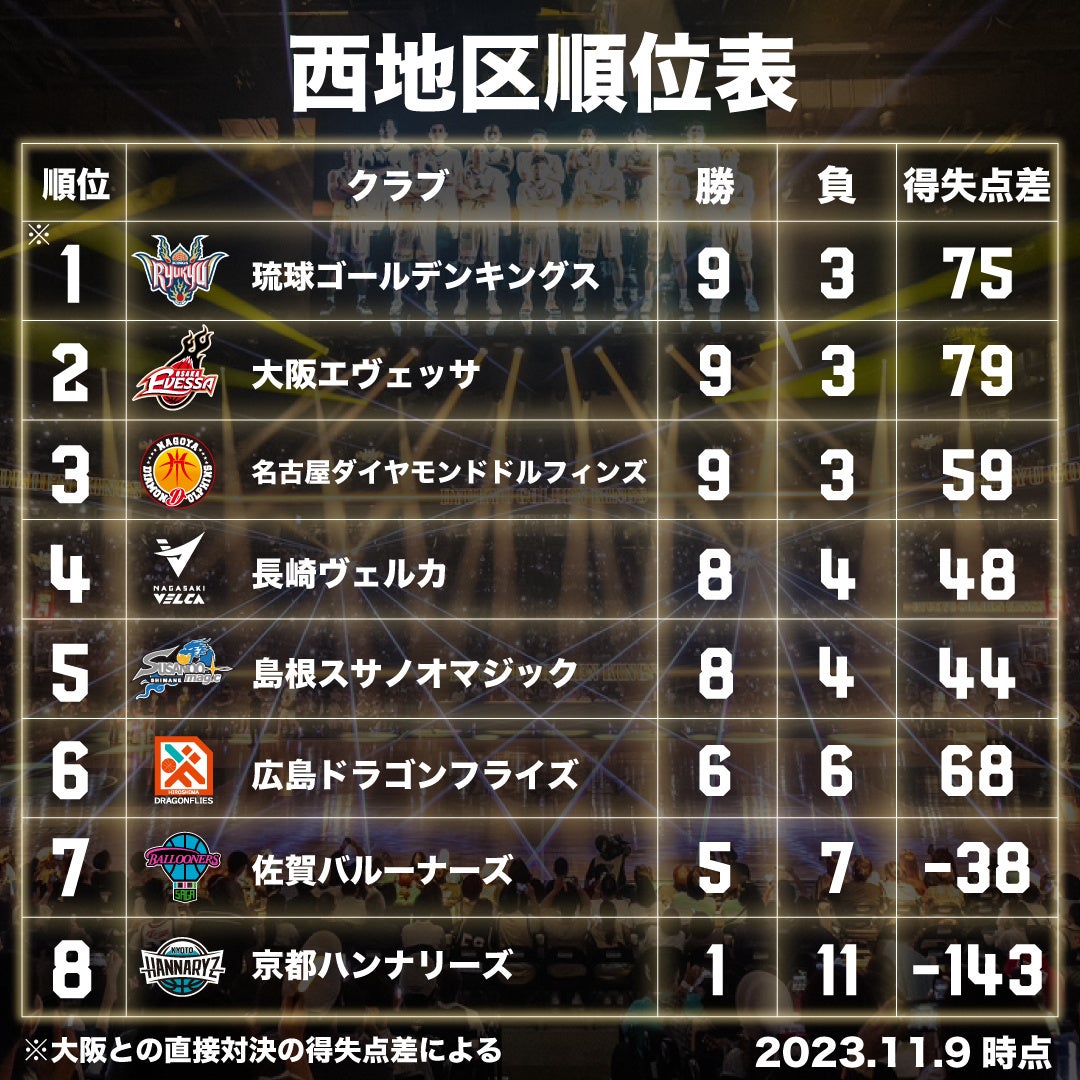 2023-24シーズンはここまで12試合が終了し、キングスは9勝3敗で大阪エヴェッサ、名古屋ダイヤモンドドルフィンズに並ぶも、直接対決の結果と得失点差で西地区1位に位置付けています。