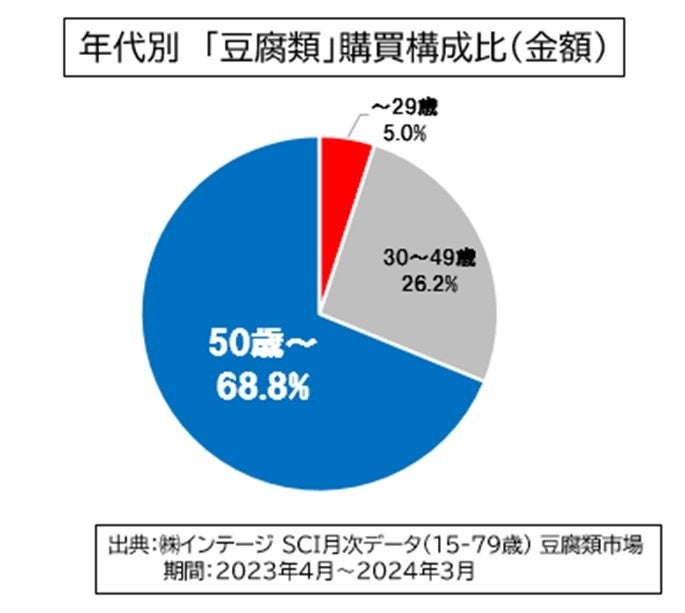 日本の食卓に欠かせない「豆腐」。コロナ前と比較すると国内市場規模の水準が上がっている一方、購買の構成は50歳以上がメインで若年層の割合が低いという課題があります。また、「豆腐」を使用するメニューに偏りがあり、味噌汁・冷奴の2メニューが6割以上を占めています。