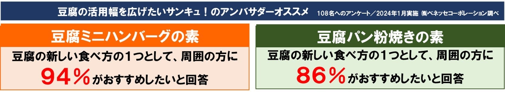 今回、株式会社ベネッセコーポレーションが発行する生活情報誌「サンキュ!」の豆腐の活用幅を広げたいと考えるアンバサダーの方へサンプリングとアンケートを発売に先駆けて実施。豆腐の新しい食べ方の1つとして、周囲の方に「ソイーネ 豆腐ミニハンバーグの素・豆腐パン粉焼きの素」をおすすめしたいと85%以上のアンバサダーの方々にご回答いただきました。