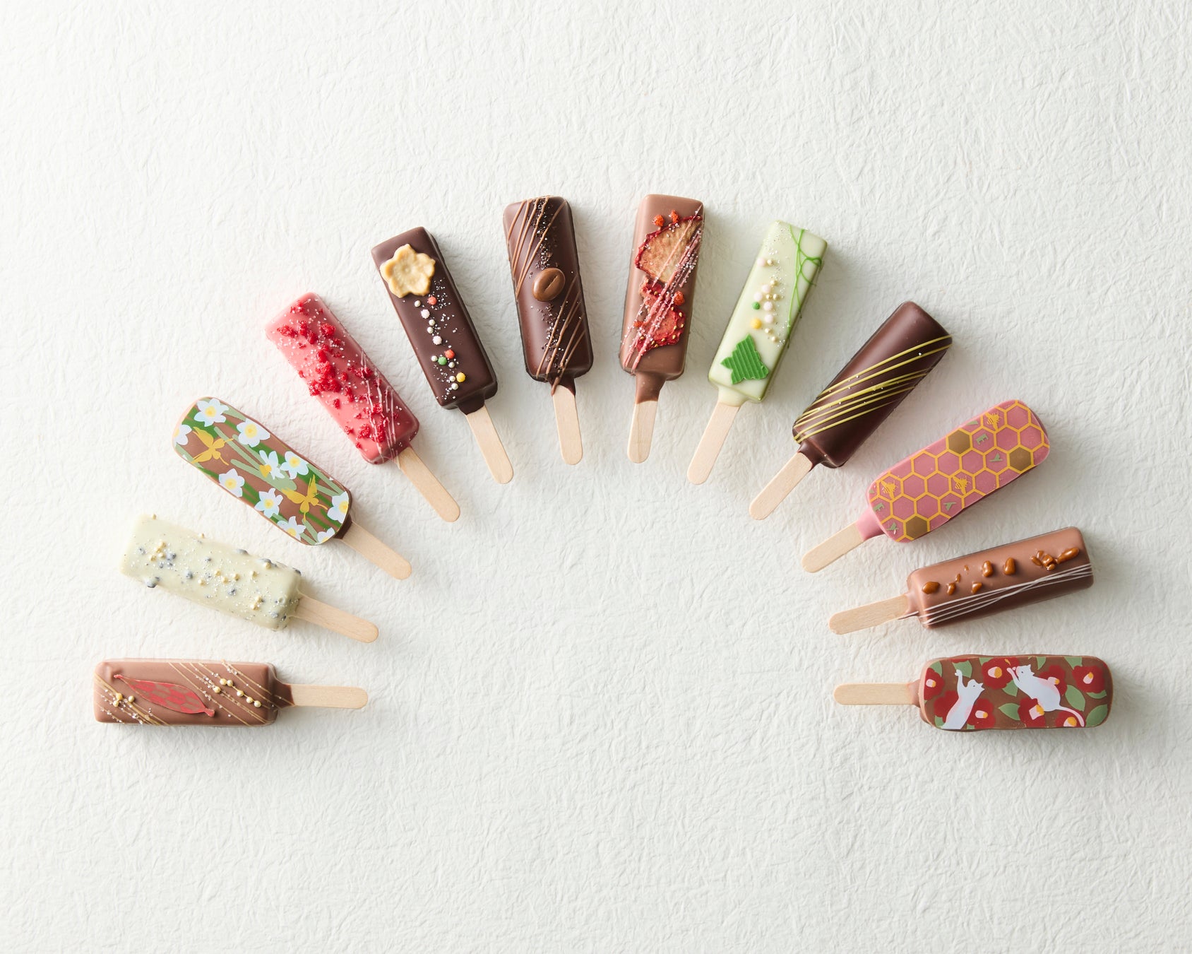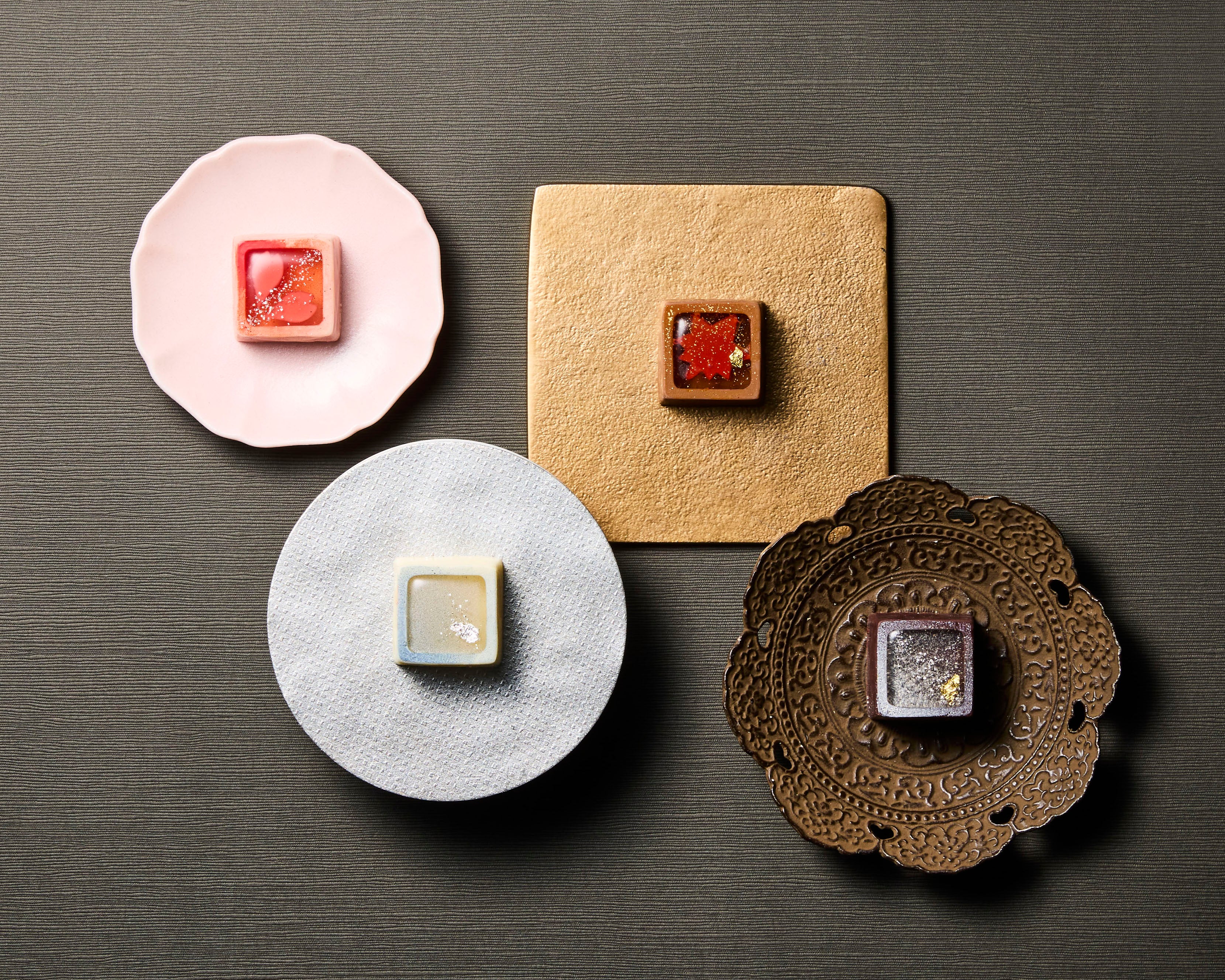 繊細な技術と和の美意識が融合した、美しい彩りのボンボンショコラ。花や鞠をモチーフに、和菓子のような優美なかたちをショコラで表現しました。キャラメルやプラリネを用いた、見た目にも味わいにも華やかさが広がるコレクションです。
