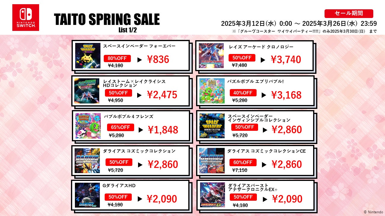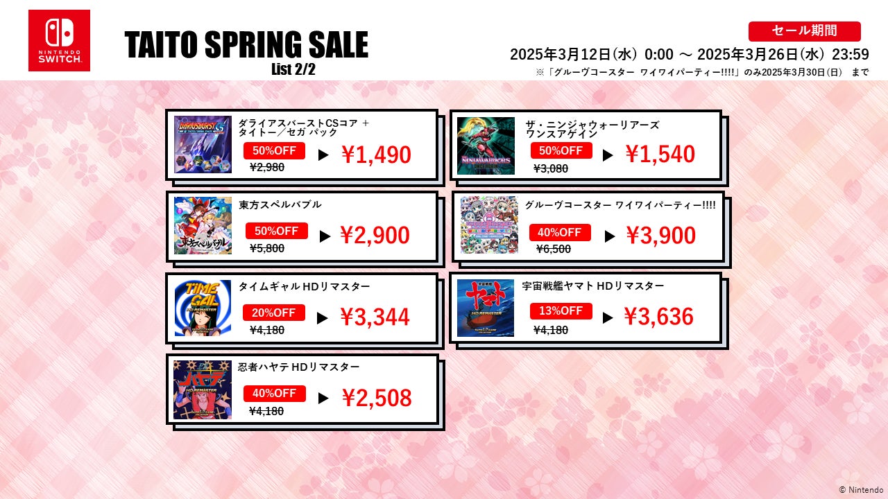 株式会社タイトー(本社:東京都新宿区、以下タイトー)は、対象のNintendo Switch™用ソフト(ダウンロード版)やPlayStation®4用ソフト(ダウンロード版)が最大80%オフとなる「タイトースプリングセール」を実施いたします。