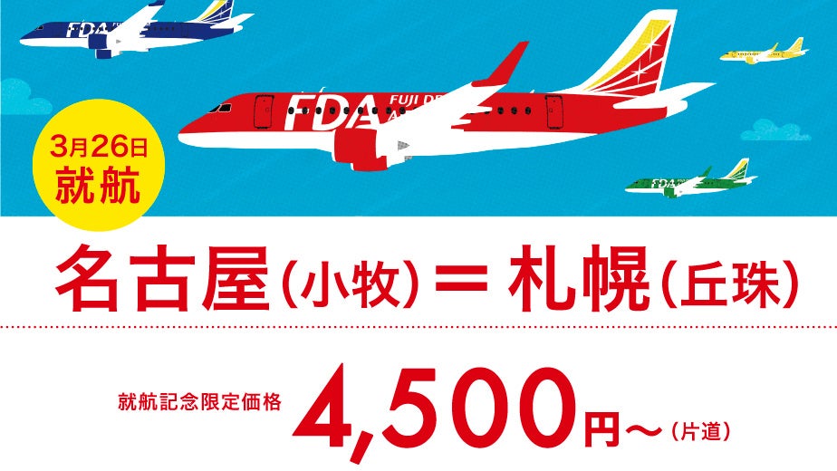FDAにとって、拠点空港である名古屋(小牧)空港から北海道地区への初めての就航となり、両空港を約100~110分で結びます。また、2023年3月26日(日)~4月28日(金)の期間については、就航を記念して、14日前までにご予約・ご購入いただける「就航記念運賃」 (片道4,500円)を設定しました。