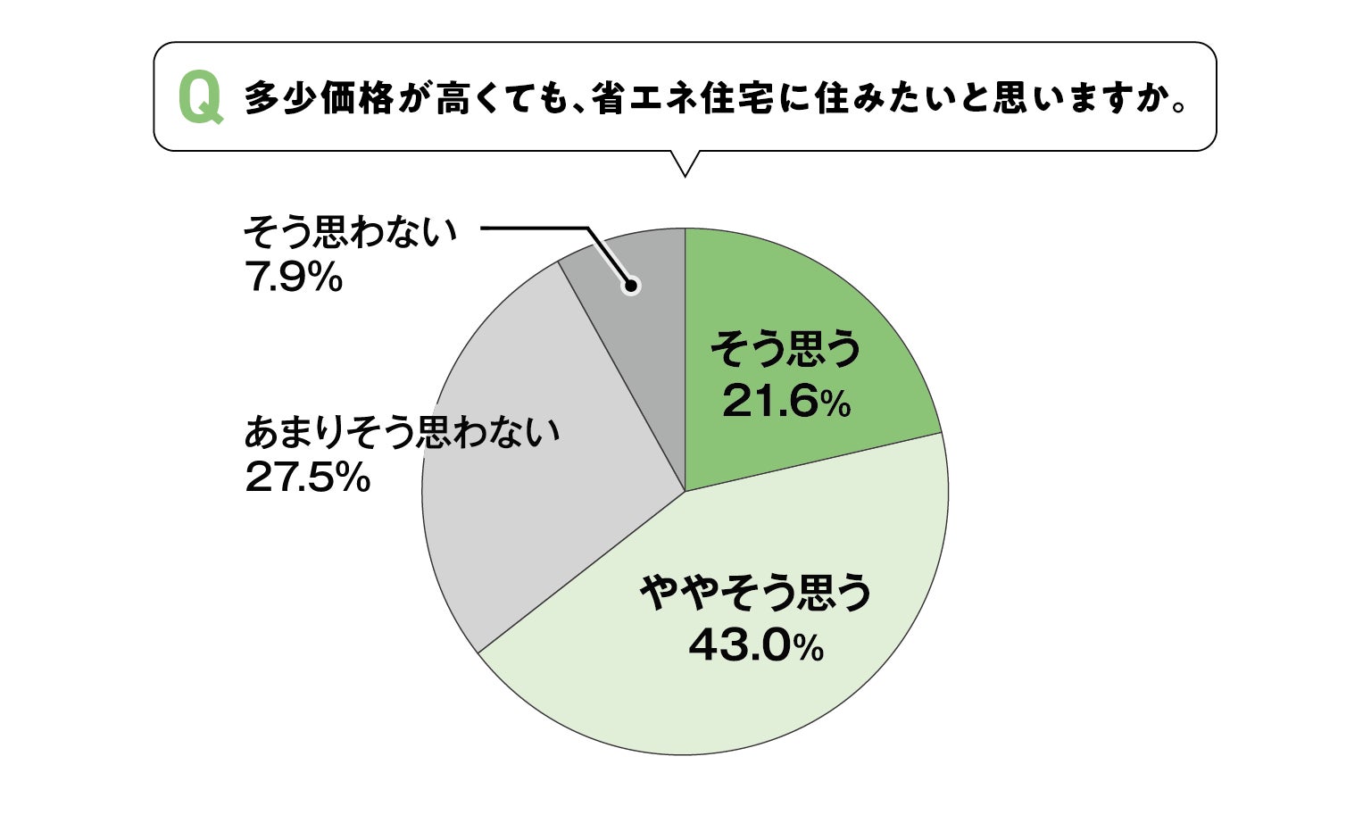 「多少価格が高くても、省エネ住宅に住みたい」と回答した人は、「そう思う」「ややそう思う」を合わせて64.6%でした。価格に関わらず、省エネ性能を重視している人は多いことが分かりました。