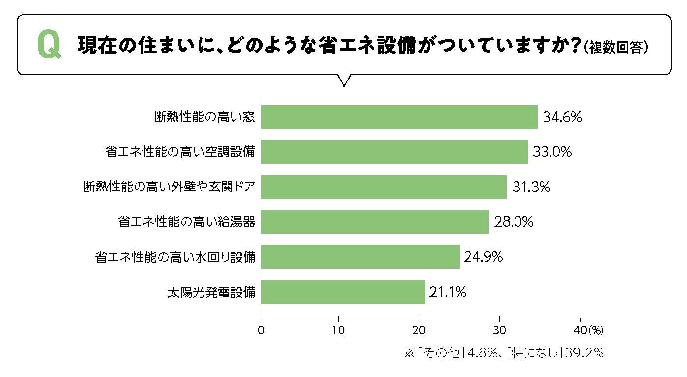 現在の住まいに、「断熱性能の高い窓」がついていると回答した人は34.6%でした。次いで、「省エネ性能の高い空調設備」と「断熱性能の高い外壁や玄関ドア」も3割以上となりました。