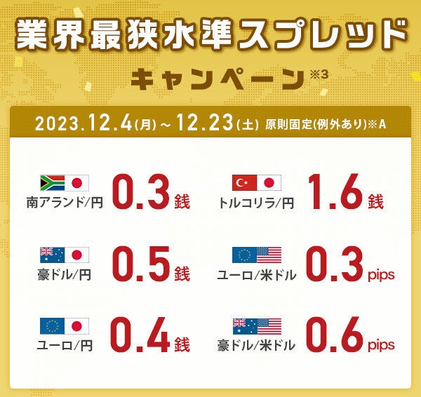 ※3 「業界最狭水準スプレッドキャンペーン」スプレッド(対象期間:2023年12月4日(月)午前9時00分~2023年12月23日(土)午前3時00分 、提示時間帯:対象期間中の各営業日午前9時~翌午前3時)