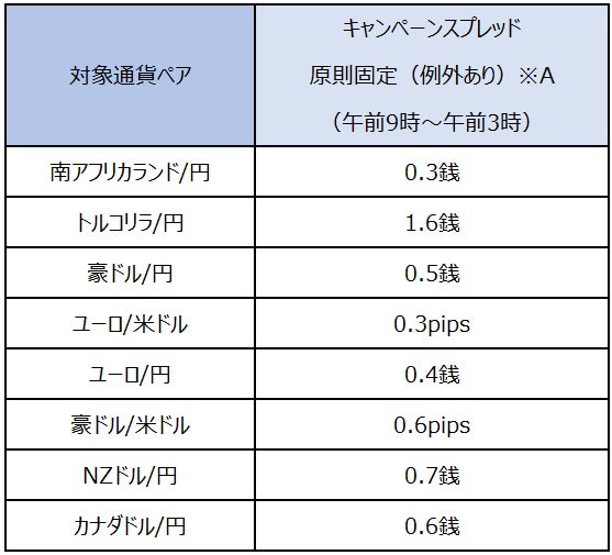 ※キャンペーンスプレッドの提示時間帯はすべて対象期間中の各営業日の午前9時~翌午前3時。同期間中の通常スプレッドは各営業日の午前3時~午前9時に提示。