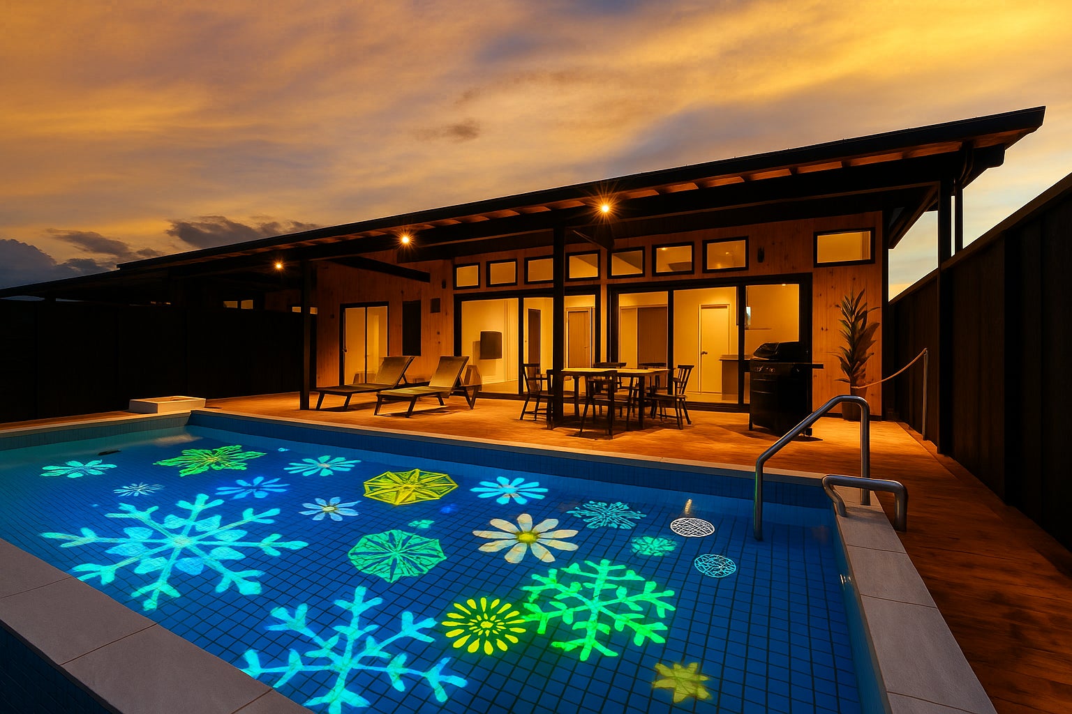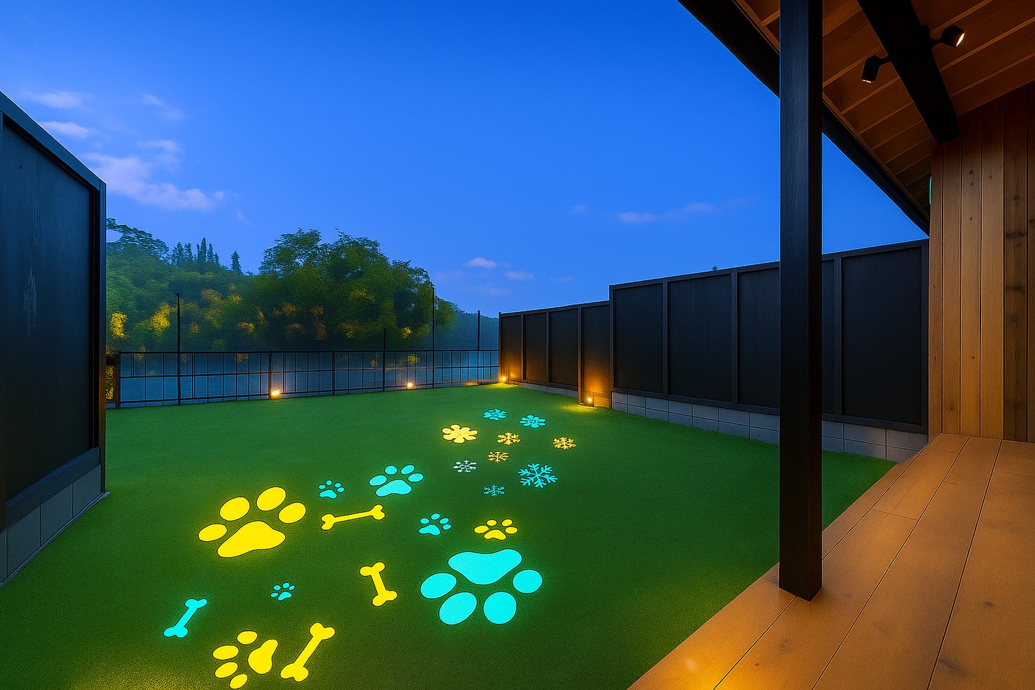 万華鏡をモチーフにした幻想的なイルミネーションや、記念日ごとにカスタマイズ可能なメッセージ投影、わんちゃん向けの足形&骨型ライトなど、宿泊者だけのために用意された完全プライベートな特別空間を実現します。