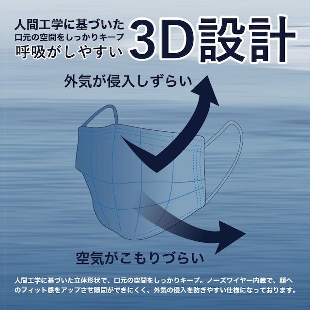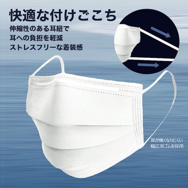 花粉対策や風邪の予防、ウイルス対策といったマスク本来の使用に限らず、気温が高くなりやすい場所やアウトドア活動、満員電車の車内などの多様なシーンで利用でき、夏場のマスクの着用で不快感を感じる時期にも快適に使用できます。このマスクはウイルスカット率99%のフィルターを採用した3層構造によりウイルスなどを99%カット※1する捕集性能を保ちながらも快適性を実現しています。また、ふんわりとやわらかく太めの耳ひもを採用することで、長時間着用しても耳が痛くなりにくく、一日中快適に過ごせます。