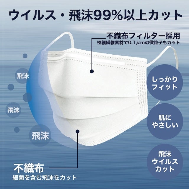 ウイルスカット率99%のフィルターを採用した3層構造によりウイルスや花粉、細菌などを99%カット※1する捕集性能を保持し、従来の製品と比べ快適さを保ちつつ高い安全性を実現しています。