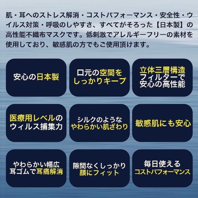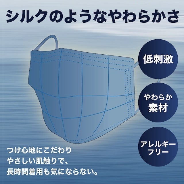 接触冷感素材をマスク内側部分に採用した使い捨てマスクです。花粉・ウイルスカット99%且つ、接触冷感マスクとして夏場のマスク着用時の不快感や息苦しさを緩和させると同時に、繰り返し使う布マスクでは得ることのできなかった衛生面での安心感も同時に実現することができました。