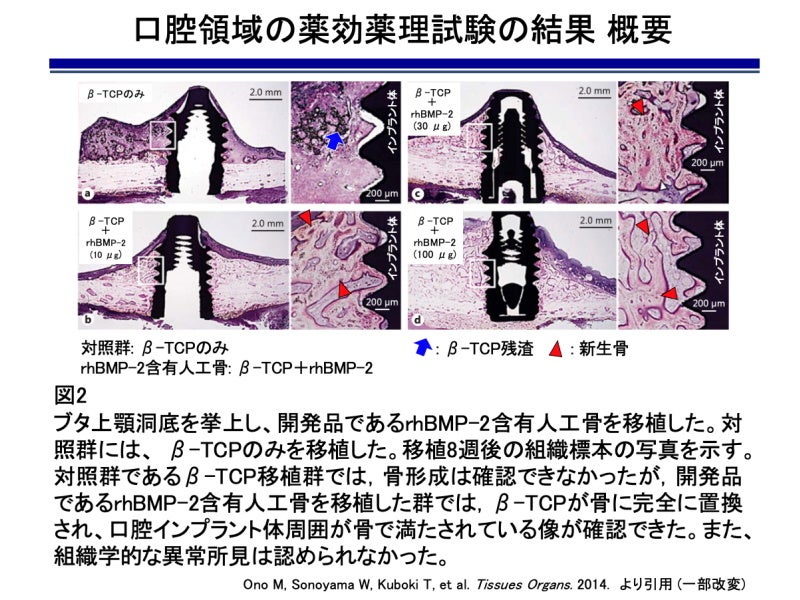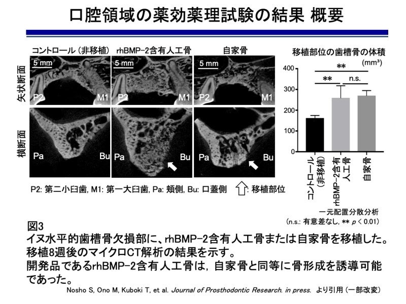 今回の大腸菌発現系由来rhBMP-2含有人工骨を用いた顎骨再生療法における医師主導治験の実施は、口腔領域では世界で初めての取り組みとなり、本邦の医薬品開発、特に生物学的製剤の開発力を国際的に示す上でも重要な意義があります。