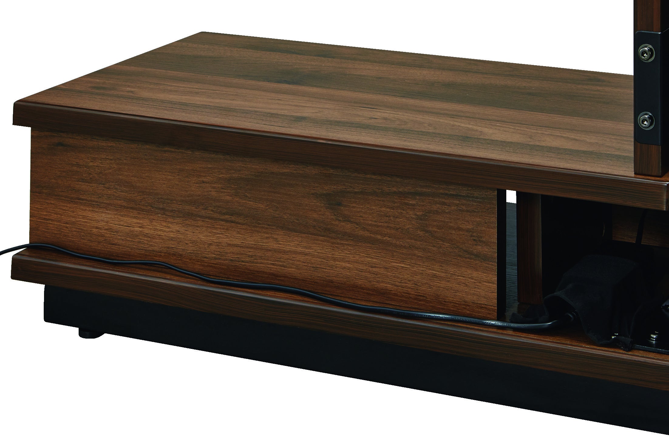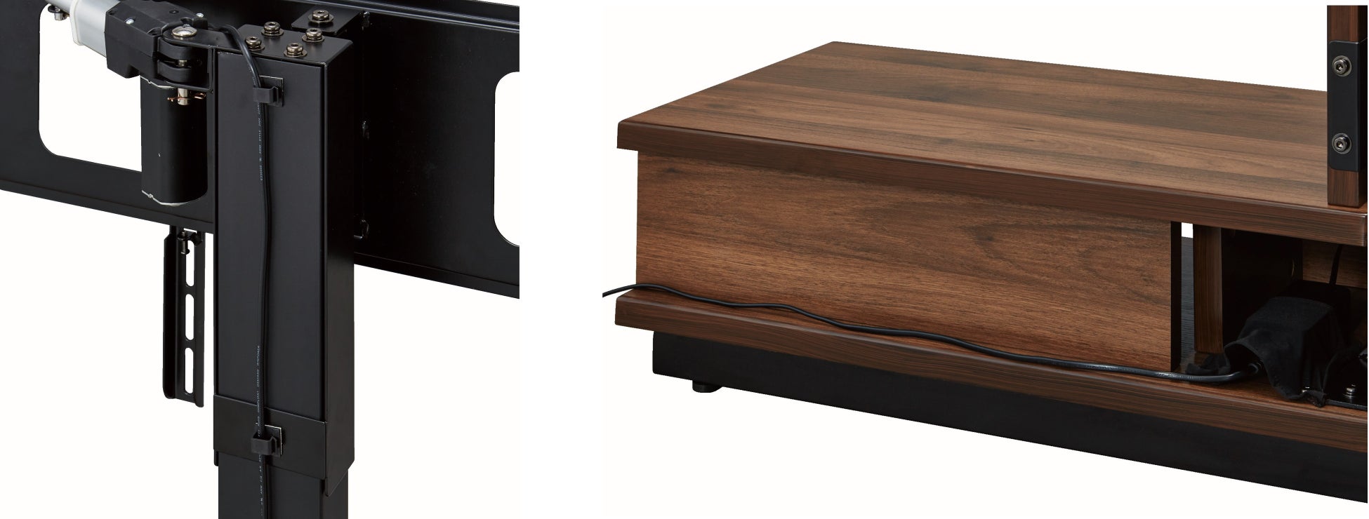 背面にはクリップが付いており、配線コードがたわむことなくスッキリとし、また昇降装置が入っている台座にはスリットを入れることで、乱れがちなAV機器の配線コードも通すことができます。壁に寄せても配線コードやアダプターをきれいに納めることができます。
