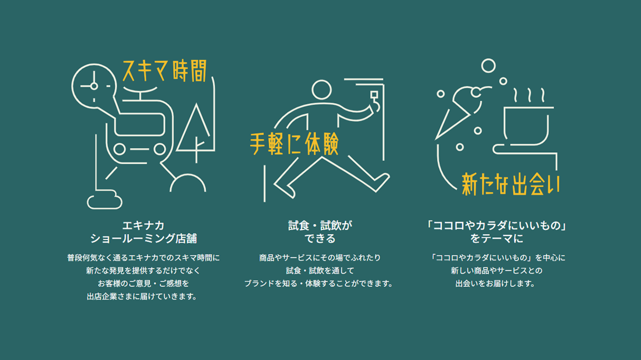 食品メーカーを中心に、「いつもの暮らしよりもちょっとだけいい日常を、手軽に体験できる」をコンセプトに出店いただき、駅でのスキマ時間に実際に触れたり、試食・試飲をすることで、ブランドやサービスを店舗を体験していただくサービスを展開しました。