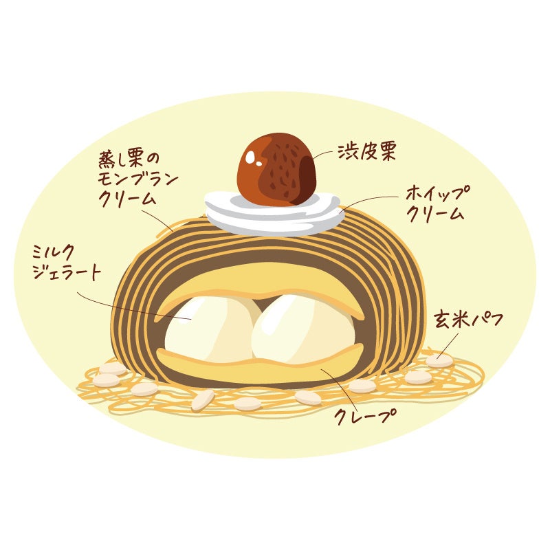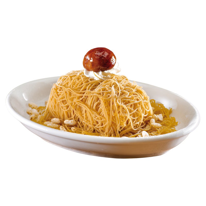 ビッグボーイの看板メニュー「大俵ハンバーグ」をモチーフにした「蒸し栗の大俵モンブラン590円(税込649円)」は、しぼりたての蒸し栗のモンブランクリームや渋皮栗の甘露煮で栗のほくほく食感と程よい甘さを存分にお楽しみいただけるデザートです。蒸し栗のモンブランクリームは、栗本来の味をしっかりと感じられるフワッとした口当たりに仕上げました。トッピングした渋皮栗の甘露煮は、じっくり煮詰めることで引き出した濃厚な甘みが特長です。蒸し栗のペーストの中にはもっちり食感のクレープで包んだミルクジェラートが隠れています。北海道産牛乳を使用したミルクジェラートの甘さ控えめでさっぱりとした味わいが、栗の甘みを引き立てます。
