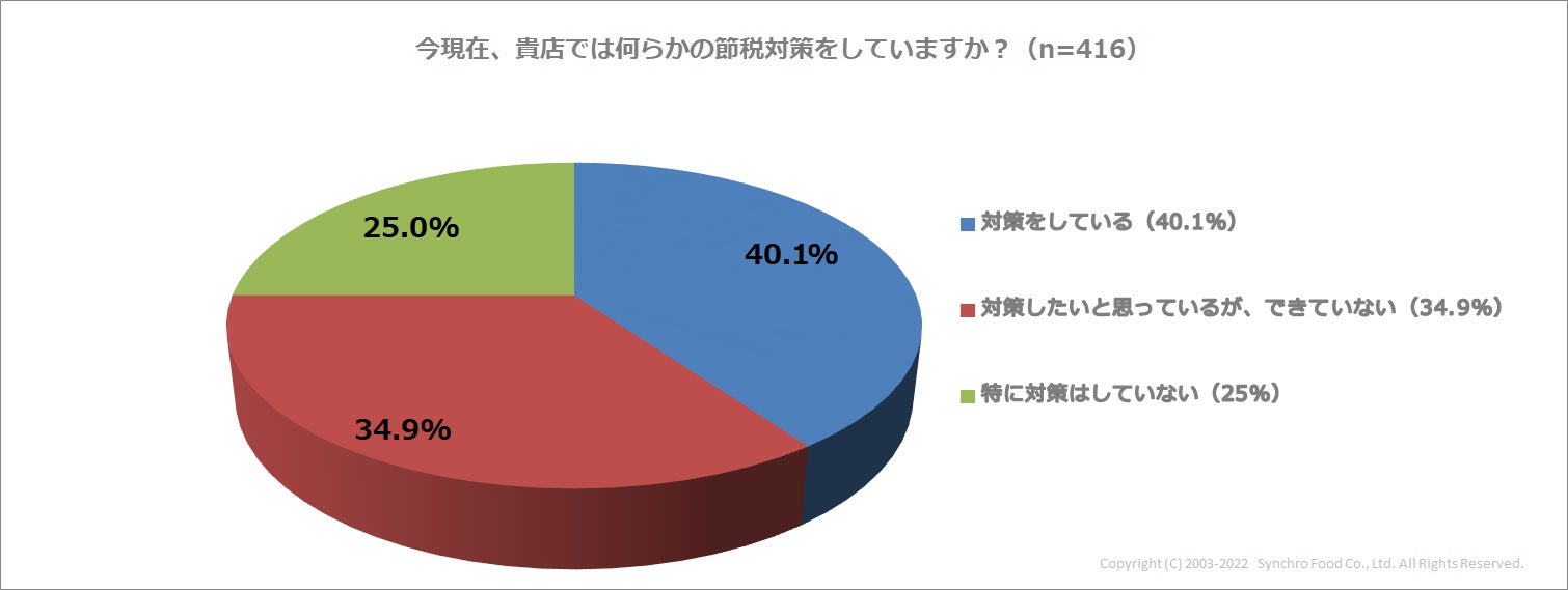 続いて、現在、何らかの節税対策をしているか尋ねたところ、「現状対策していない」(対策したいと思っているが、できていない=34.9%、特に対策はしていない=25.0%)と回答した店舗は約6割。一方で「対策をしている」店舗は40.1%にとどまりますが、「対策したいと思っているが、できていない」店舗が34.9%いることを踏まえると、75%もの店舗が節税に前向きな様子が読み取れます。