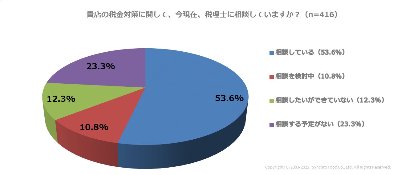次に現在、税理士に相談しているか尋ねたところ、半数以上が「相談している(53.6%)」ことが明らかとなりました。また、「相談を検討中(10.8%)」と前向きな店舗がいる一方、12.3%は、費用などを理由に「相談したいが、できていない」状況にあります。「相談する予定がない」との回答は、23.3%でした。