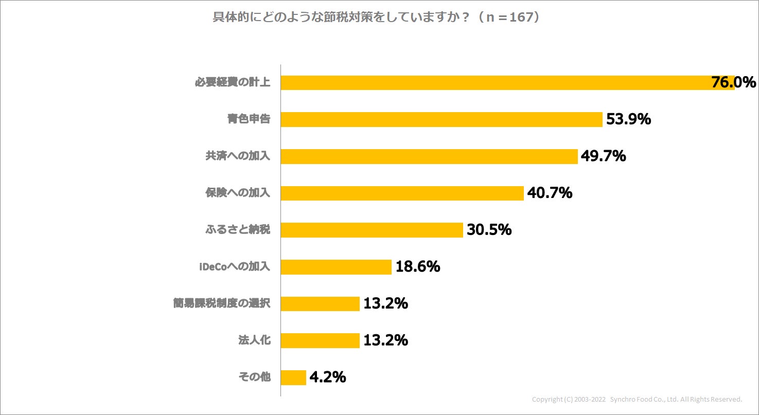 飲食店に特化したリサーチサービス「飲食店リサーチ」(https://www.inshokuten.com/research/company/)を運営する株式会社シンクロ・フード(本社:東京都渋谷区、代表取締役:藤代真一、東証プライム市場:3963)は、飲食店ドットコム会員を対象に、飲食店における節税対策の実情についてアンケート調査を実施いたしました。