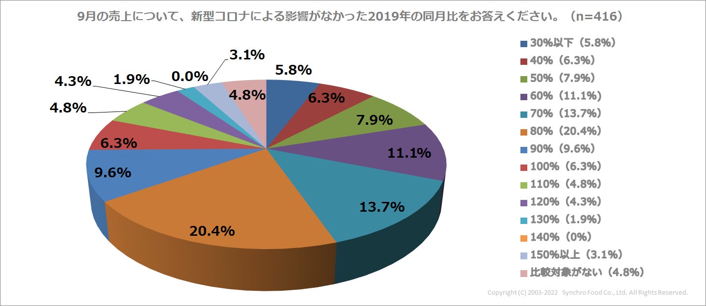 一方、売上が伸びた(「110%以上」)店舗は14.1%。単純な比較はできないものの、同様の調査を行った先月のデータ(https://www.inshokuten.com/research/result/369)と比べると、2019年同月比より売上が伸びた店舗の割合が約6%増えており(2022年8月売上の2019年同月比において「110%以上」は8.4%)、わずかながら回復の兆しが見えてきた印象です。