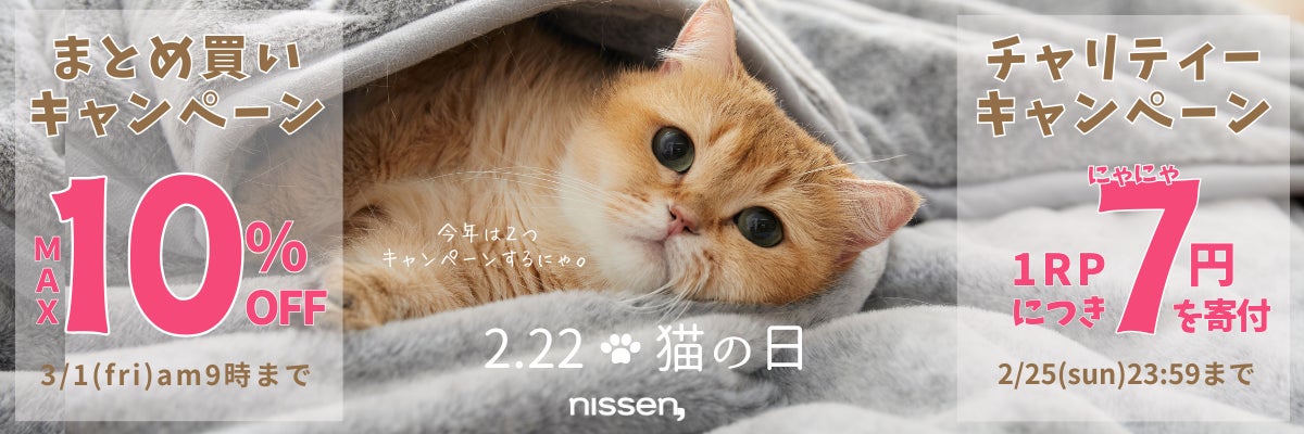 さらに、ニッセンオンラインショップ(https://www.nissen.co.jp/ ) で、猫にまつわる商品の「まとめ買いキャンペーン」を開催。「猫フィール」シリーズ全商品を含む対象商品のまとめ買いで、最大10%OFFになるお得なキャンペーンです。詳細は、特設ページをご覧ください。なお、キャンペーンの終了日時はそれぞれ異なります。各キャンペーンの実施概要をご確認ください。