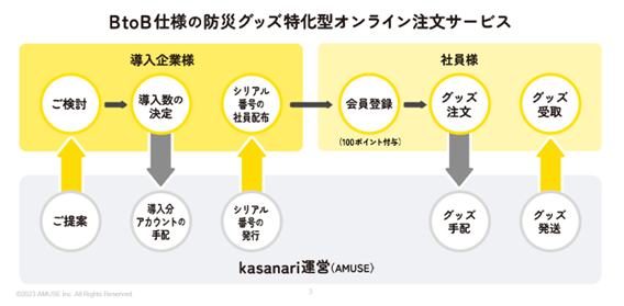 組織(企業・団体)様の導入数(利用者)分のシリアルコードをアミューズが発行。シリアルコードを使って会員登録すると、100 ポイントがサイト内で付与されます。そのポイントを使って、利用者がそれぞれ防災グッズをセレクトして注文することができます。