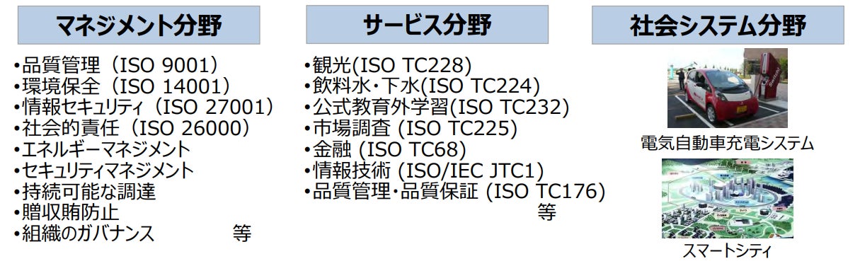 近年の国際標準化の対象は、マネジメント分野・サービス分野・社会システム分野まで拡大されています。