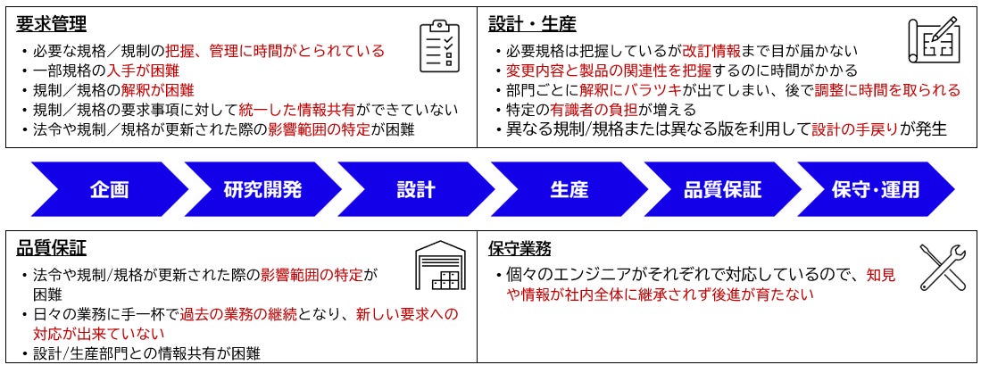 これらのリスクを回避するためにも、国際工業規格に関する最新情報を、社内全体で共有・確認できる仕組みが求められています。しかし、多くの企業では、規格文書を紙媒体やPDF形式で個別に保管しており、規格/規制の共有・検索や管理や更新情報の把握の難しさなど、さまざまな課題が指摘されています。