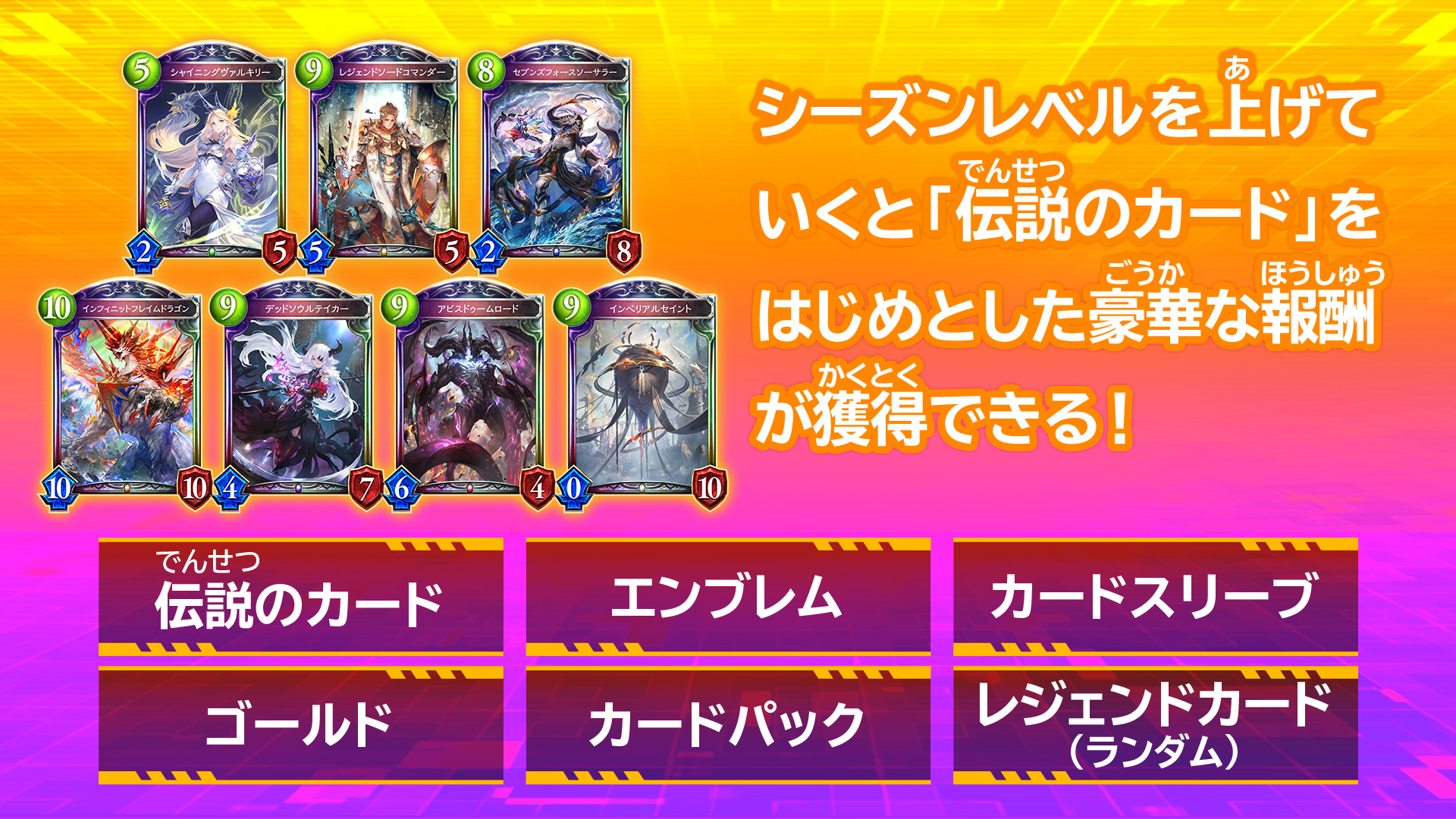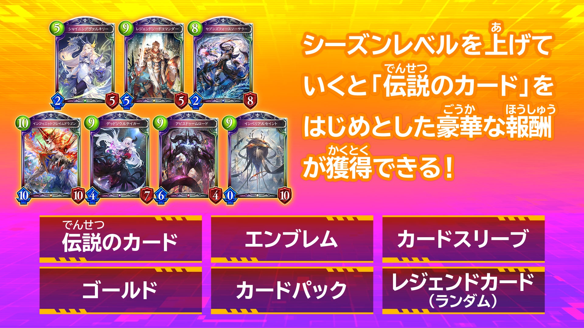 本商品に含まれる「プレミアムパス 伝説のカード+10レベル」は、シーズンレベルを10上げるのに必要なポイントがあらかじめ付与された上で、シーズンレベルを上げていくと強力な「伝説のカード」を含む豪華な報酬を獲得することができるDLCです。