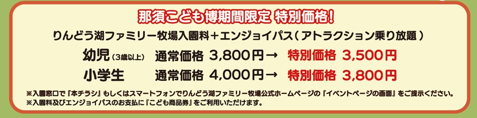 那須町町制施行70周年を記念し、一般社団法人 日本玩具協会と那須地区ホテル&レジャー施設連絡協議会、那須高原りんどう湖ファミリー牧場が共同主催のお子様向けイベント「那須こども博」を開催いたします。70周年のフィナーレを飾るイベントとして、那須町民の皆様と観光のお客様に喜んでいただける、玩具メーカーの様々なおもちゃコーナーや、地元施設とのタイアップイベントなど楽しいイベント盛りだくさんです!