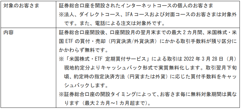 2021年7月1日に開始した「Wow!株主デビュー!~米国株式手数料Freeプログラム~」は、総合口座開設後、口座開設月の翌月末までの最大2ヵ月間の米国株式の取引手数料が無料となるプログラムです。これまでは、米国株式の通常取引時(スポット注文)の売買手数料のみが無料対象でしたが、多くのお客さまからのご要望にお応えし、2022年3月28日(月)現地約定分から、米国株式・ETF定期買付サービスを利用した取引についても取引手数料を実質無料とします。当初はキャッシュバックにより実質無料化しますが、4月頃を目途に注文時から手数料無料となるようシステム対応を予定しています。