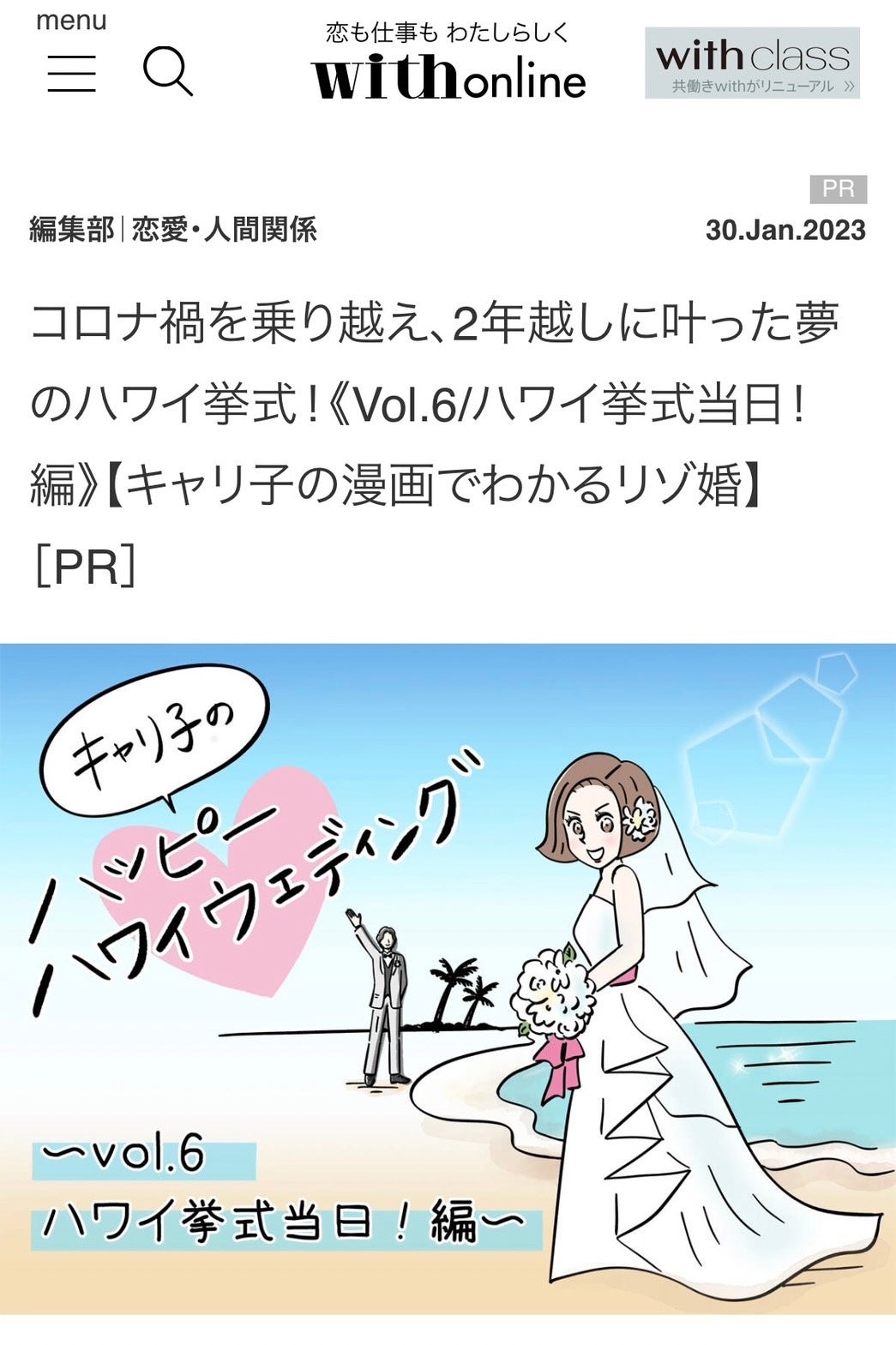 ワタベウェディング株式会社【本社:京都府京都市、代表取締役 社長執行役員:谷 浩太郎】は、講談社の女性誌「with」のオフィシャルWEBサイト「with online」(URL:https://withonline.jp/)とのコラボレーション企画により、人気連載「#キャリコン」などで活躍中の「キャリ子」こと岡山里香さんの、リゾ婚準備から挙式までを漫画でレポートする「キャリ子のハッピーハワイウェディング」を「with online」にて連載中です。この度、第6回目の連載「ハワイ挙式当日編」(URL:https://withonline.jp/love/RbSxk)を本日2023年1月30日(月)より公開いたします。