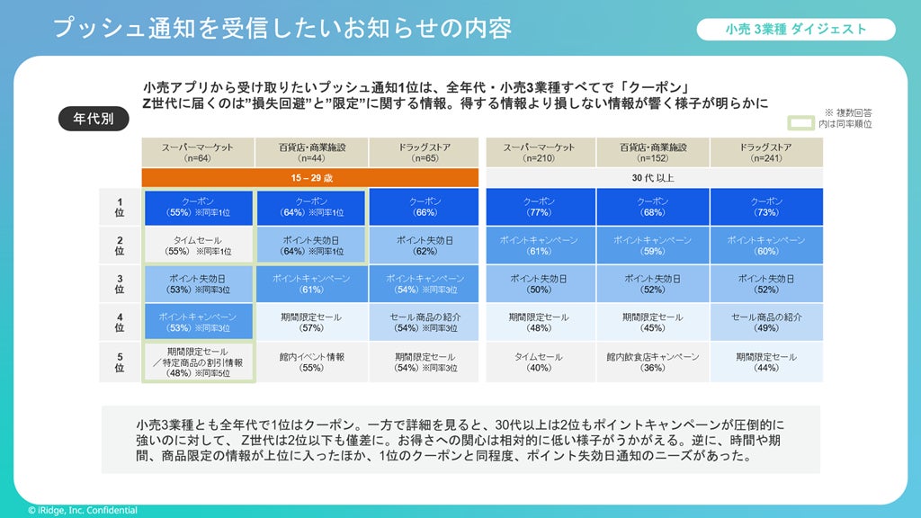 ・小売アプリから受け取りたいプッシュ通知1位は、全年代・小売3業種すべてで「クーポン」