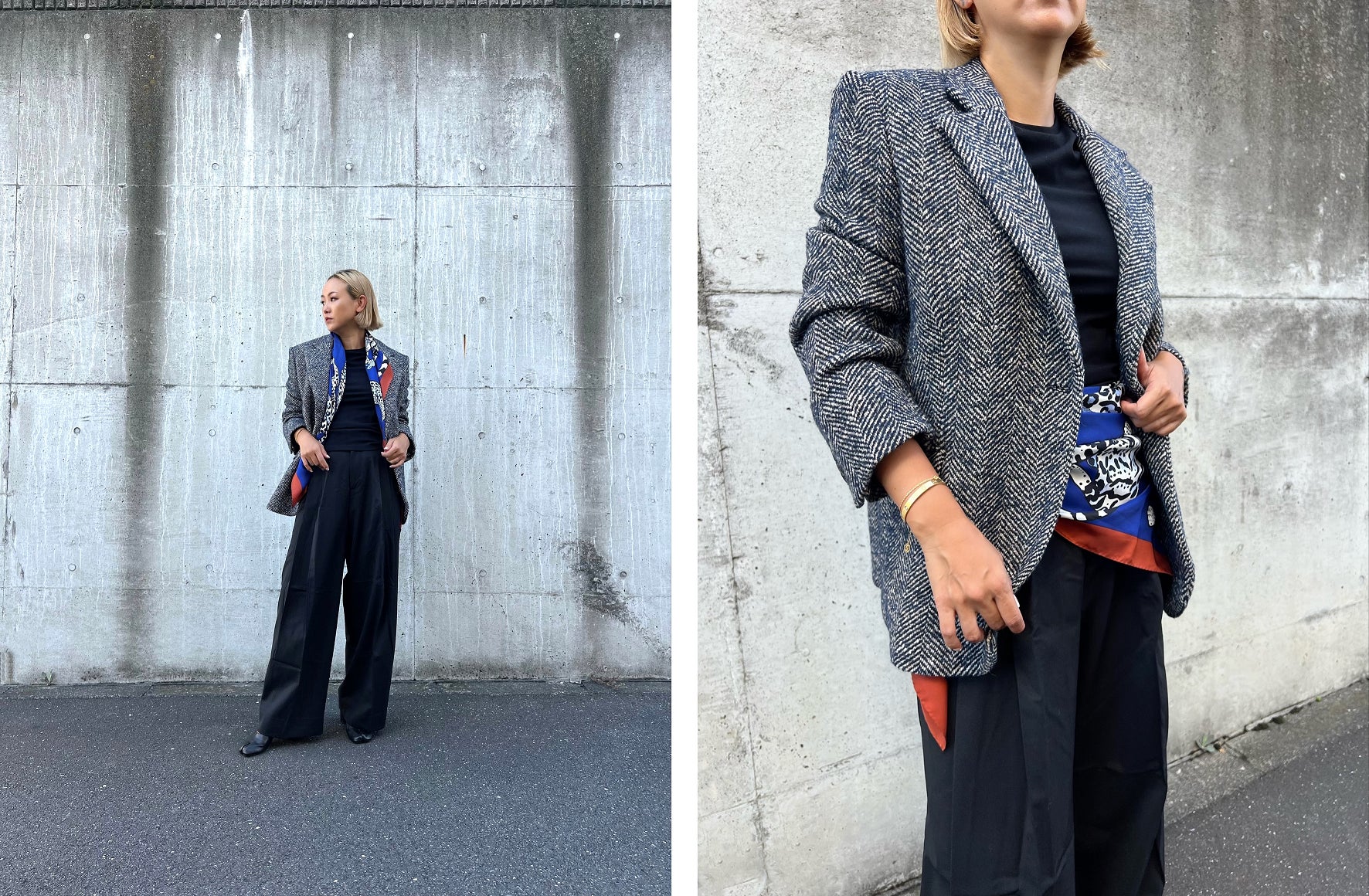 “これからの時期にピッタリな上品で形が綺麗なジャケット。カジュアルスタイルからドレスアップまで幅広いシーンで使えそうな1枚。ワイドパンツとコットン素材のTシャツと合わせたよ。”