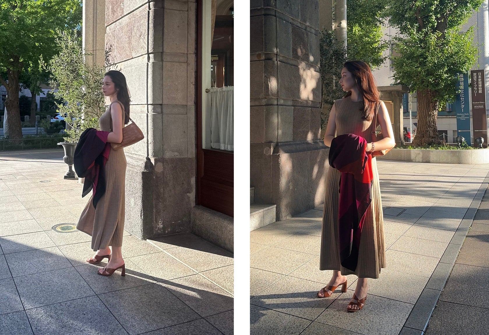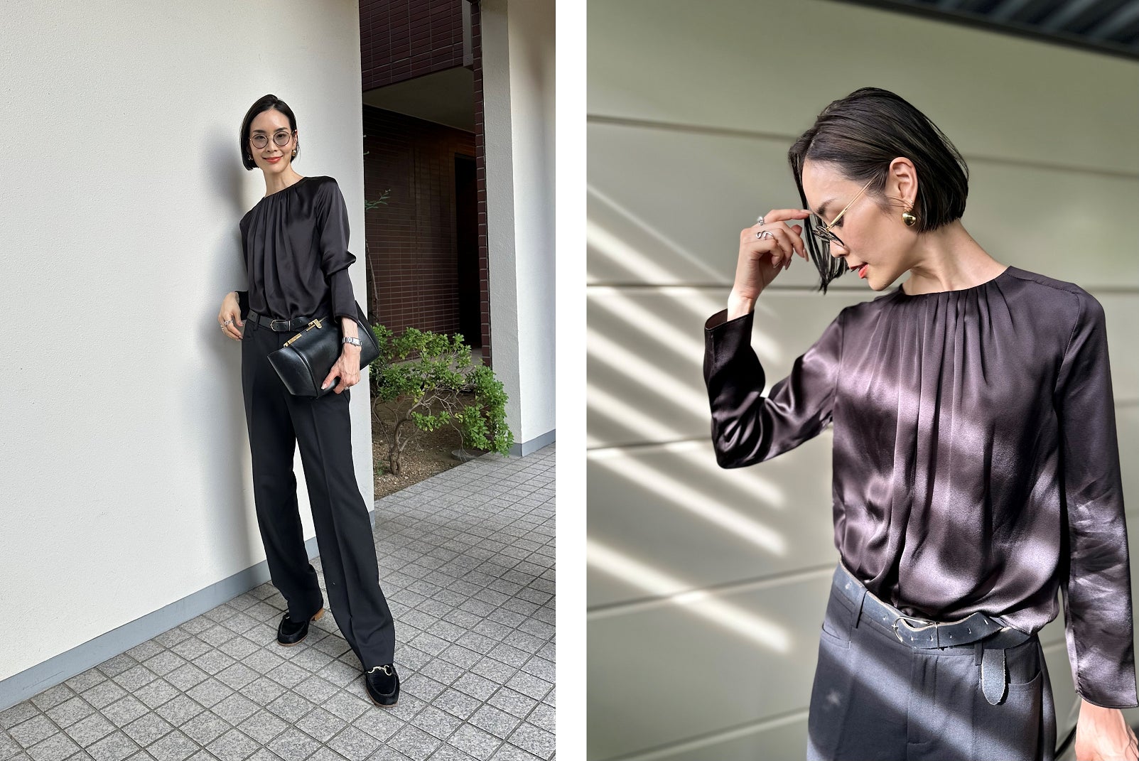 “ブラウスはシルク100%ならではの美しいドレープ。濃茶というカラーもまた絶妙!少しドレスアップしたい日に気張らず着れてちょうどいい。パンツも同じくバナリパなのだけど、ストンときれいなストレートシルエットで軽くてシワになりにくいの!まさにタイムレスな一本。”