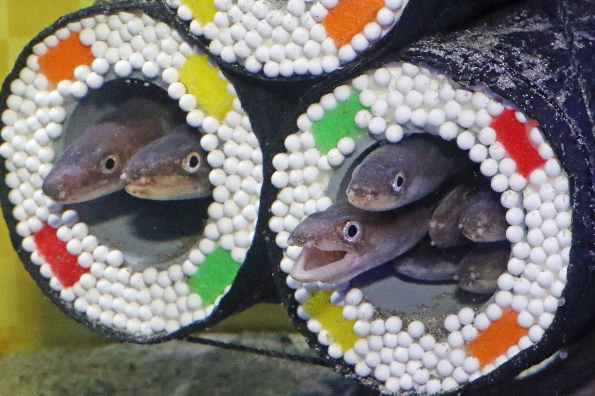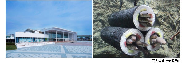 アナゴは狭い場所を好み穴などに潜り込む習性があるため、恵方巻を模した筒を水槽内に設置し、アナゴが筒に入ることにより、アナゴの顔や尾びれが穴から出て、まるで本物の具に見える仕組みです。アナゴの特性を活かした水族館ならではの福を呼び込む特別展示をお楽しみください。